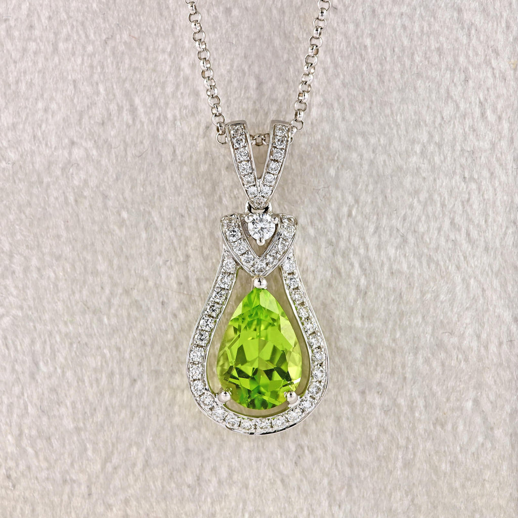 Elegantly radiant, this 18ct white gold pendant showcases a vivid 2.20ct pear-cut natural peridot wrapped in a shimmering halo of brilliant-cut diamonds totalling approximately 0.55 carats. The graceful open-work silhouette, enriched with diamond-set curves and an Art Nouveau–inspired bale, gives the piece beautiful movement and a refined, romantic presence. Its bright, fresh green peridot glows vividly against the cool white gold, offering a luxurious contrast that catches the light effortlessly.