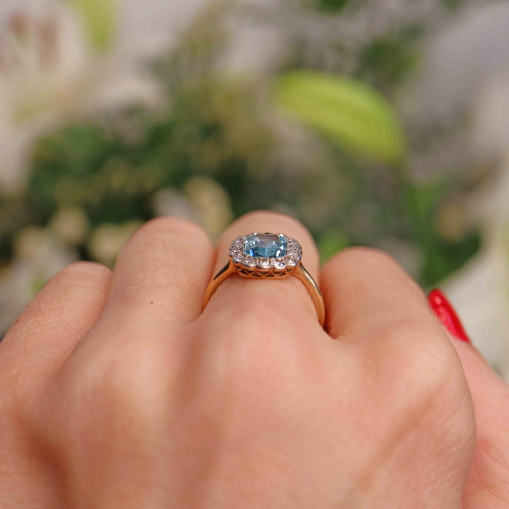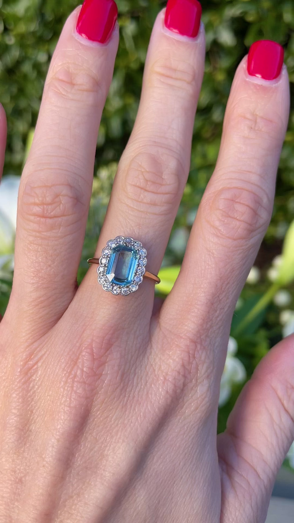 Art Deco Aquamarine & Diamond 18ct Gold Platinum Cluster Ring