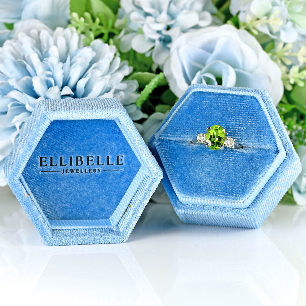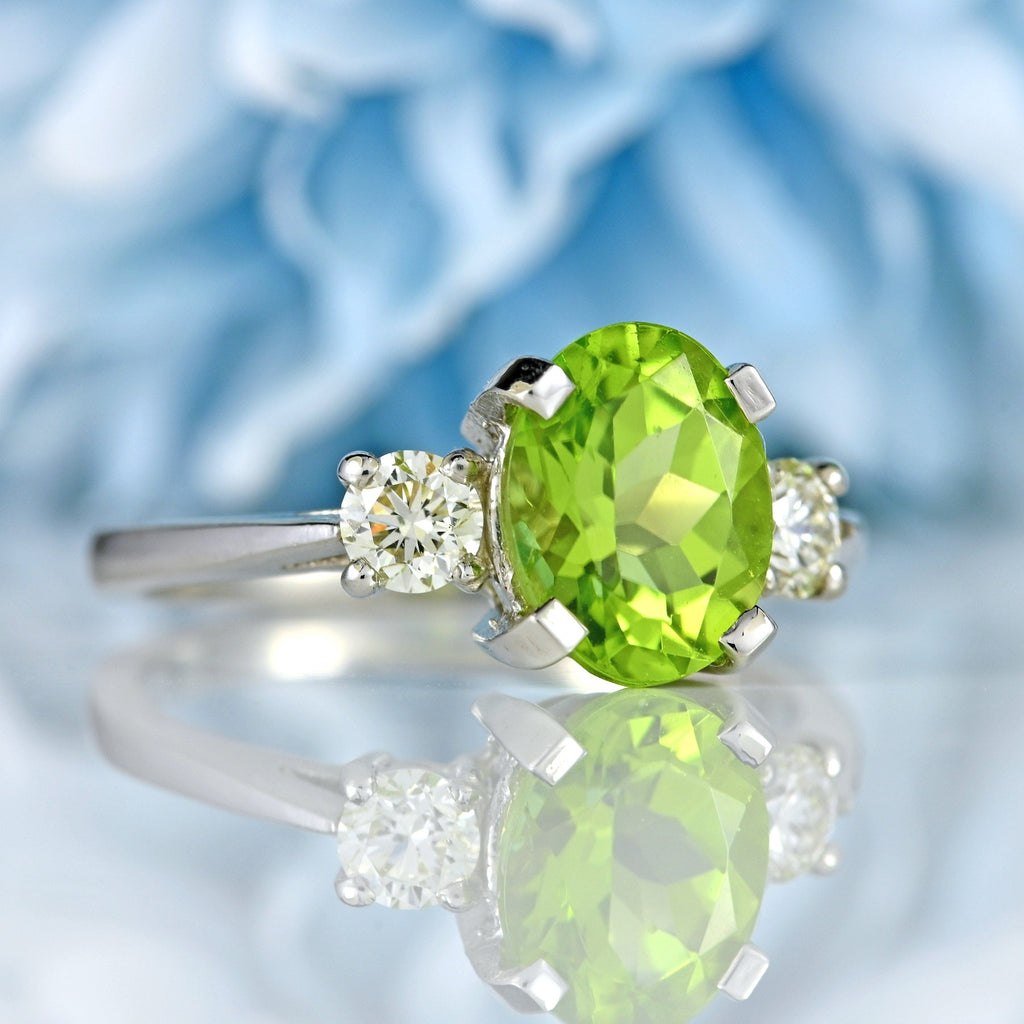 Crafted in cool, lustrous platinum, the setting feels timeless and elegant, allowing the gemstones to take centre stage while offering excellent durability for everyday wear. Clean lines and refined proportions give this ring a confident, modern presence, while the vivid peridot ensures it remains distinctive and full of character. A beautiful choice for someone seeking an engagement ring that feels both classic and refreshingly different.
