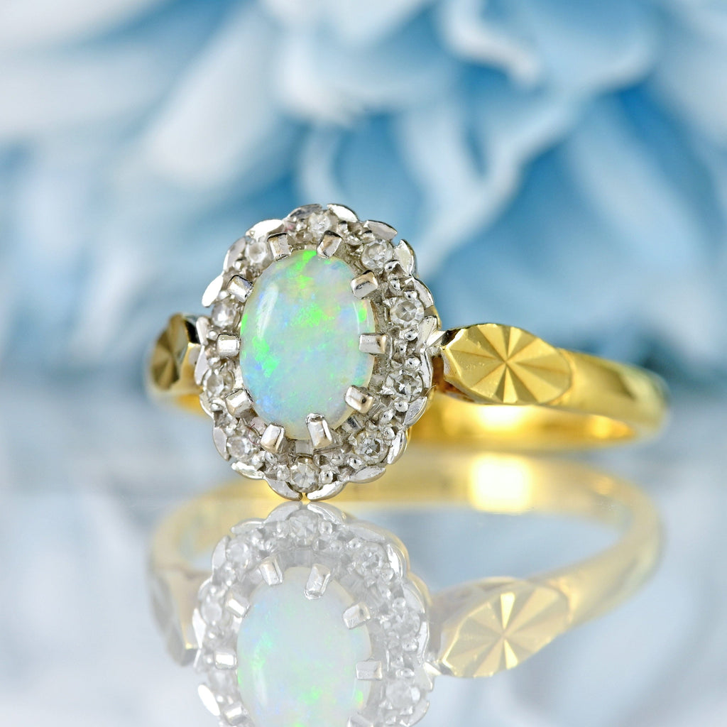 This charming vintage cluster ring features a luminous oval cabochon opal at its heart, glowing softly with flashes of green and pastel fire that shift beautifully with the light. Encircling the opal is a delicate halo of ten bright round-cut diamonds, adding gentle sparkle and framing the centre stone with classic elegance.