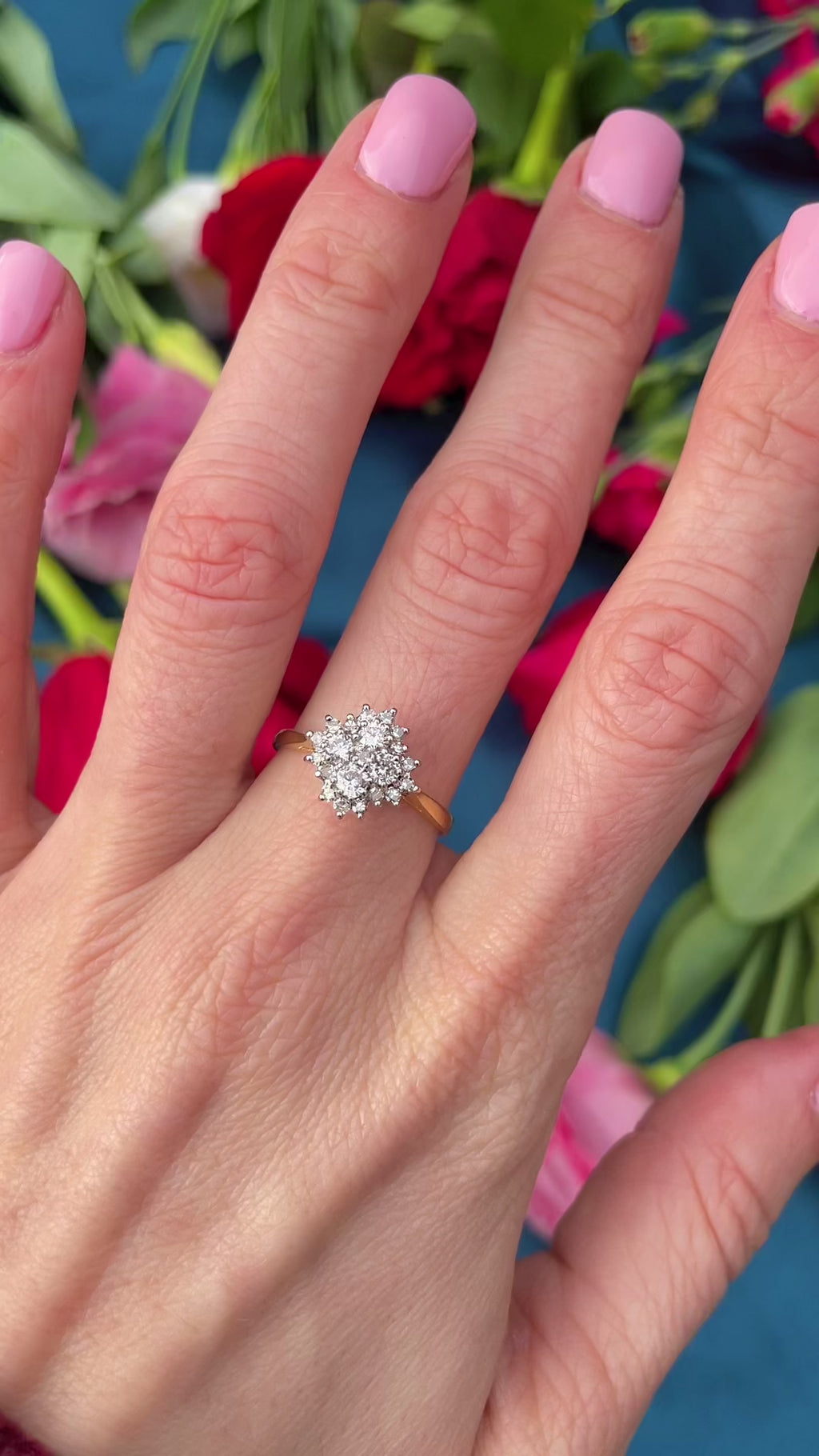 Crafted in warm 18ct yellow gold, the cluster is raised just enough to allow light to pass through the stones while maintaining a comfortable, wearable profile on the finger. The classic proportions and considered setting give the ring a timeless presence, making it equally suited to everyday wear or as a meaningful statement piece.