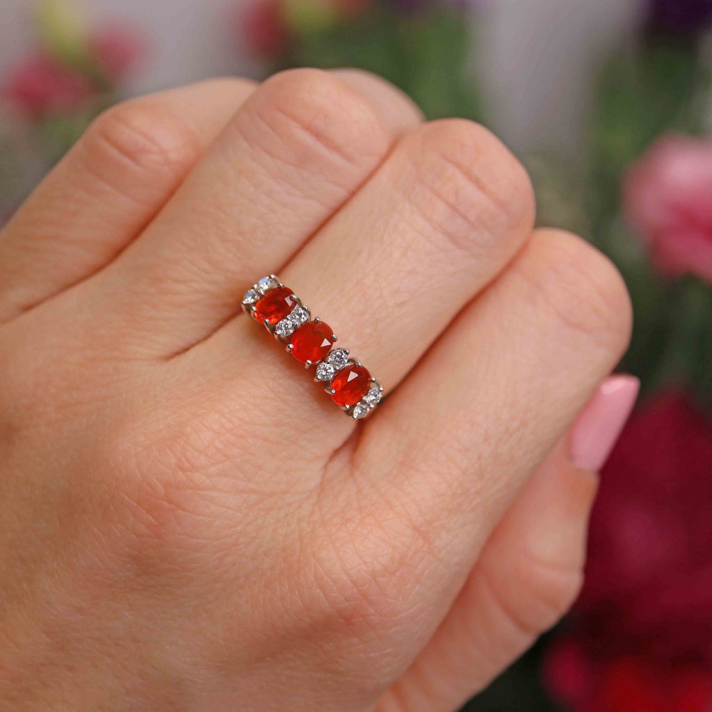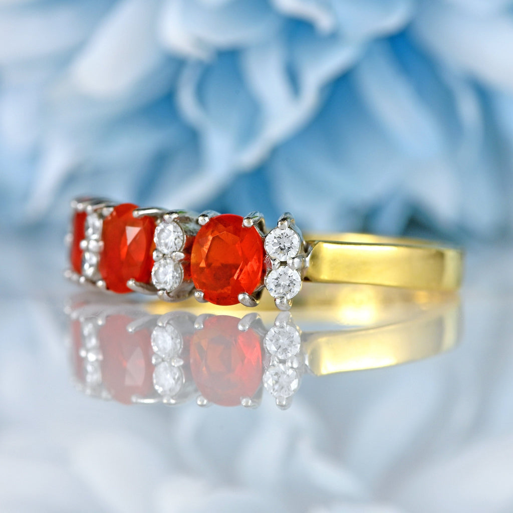 The three oval-cut fire opals glow with warm flashes of orange and red, their vivid colour intensified by a row of brilliant-cut diamonds set between each stone. The diamonds add crisp contrast and elegant sparkle, while the smooth gold band provides a timeless and comfortable finish. Balanced, eye-catching, and effortlessly wearable, this ring makes a distinctive statement worn alone or stacked with complementary bands.