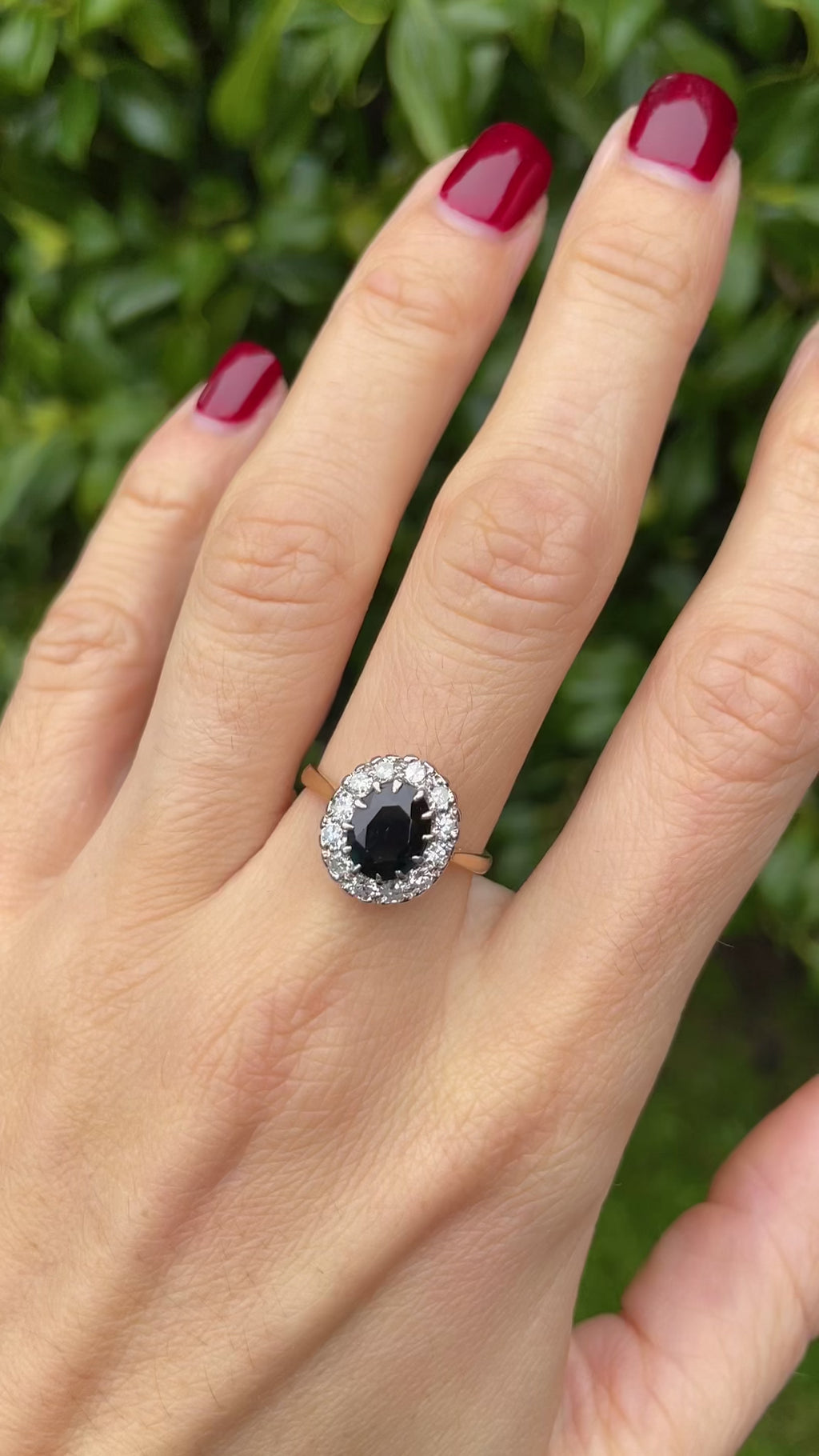 An exquisite example of mid-century craftsmanship, this sapphire and diamond cluster ring captures timeless elegance with a refined, enduring charm. At its centre glows a mesmerising, deep greenish-blue oval sapphire of approximately 1.80 carats, surrounded by twelve sparkling eight-cut diamonds.
