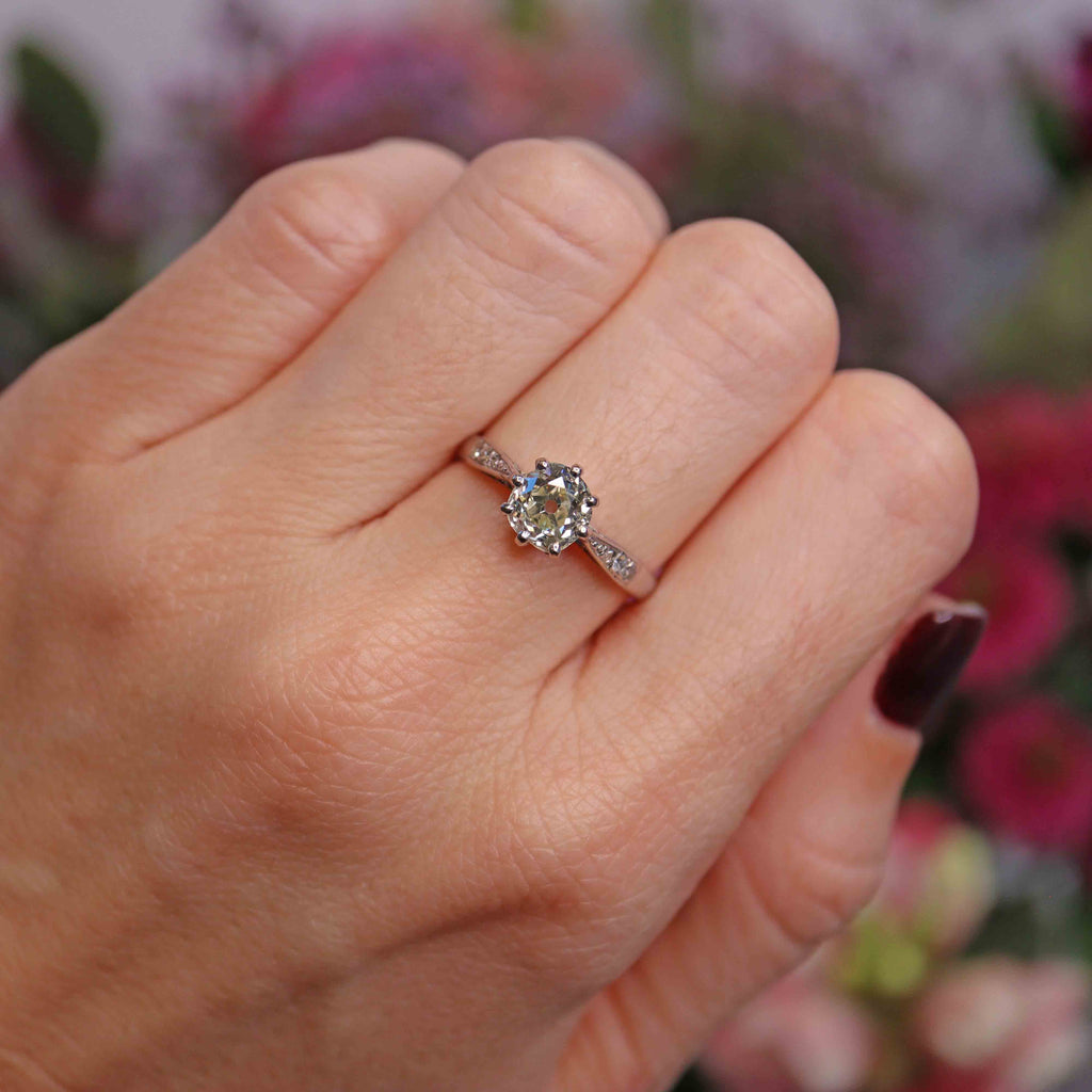 The diamond is securely held in a classic six-claw platinum setting, allowing light to enter from all angles, while the gently tapered shoulders are accented with six delicately set round diamonds that add subtle brilliance without detracting from the centre stone. Crafted entirely in platinum, the ring balances vintage charm with a refined, wearable silhouette—perfect for someone drawn to understated elegance with a story behind it.