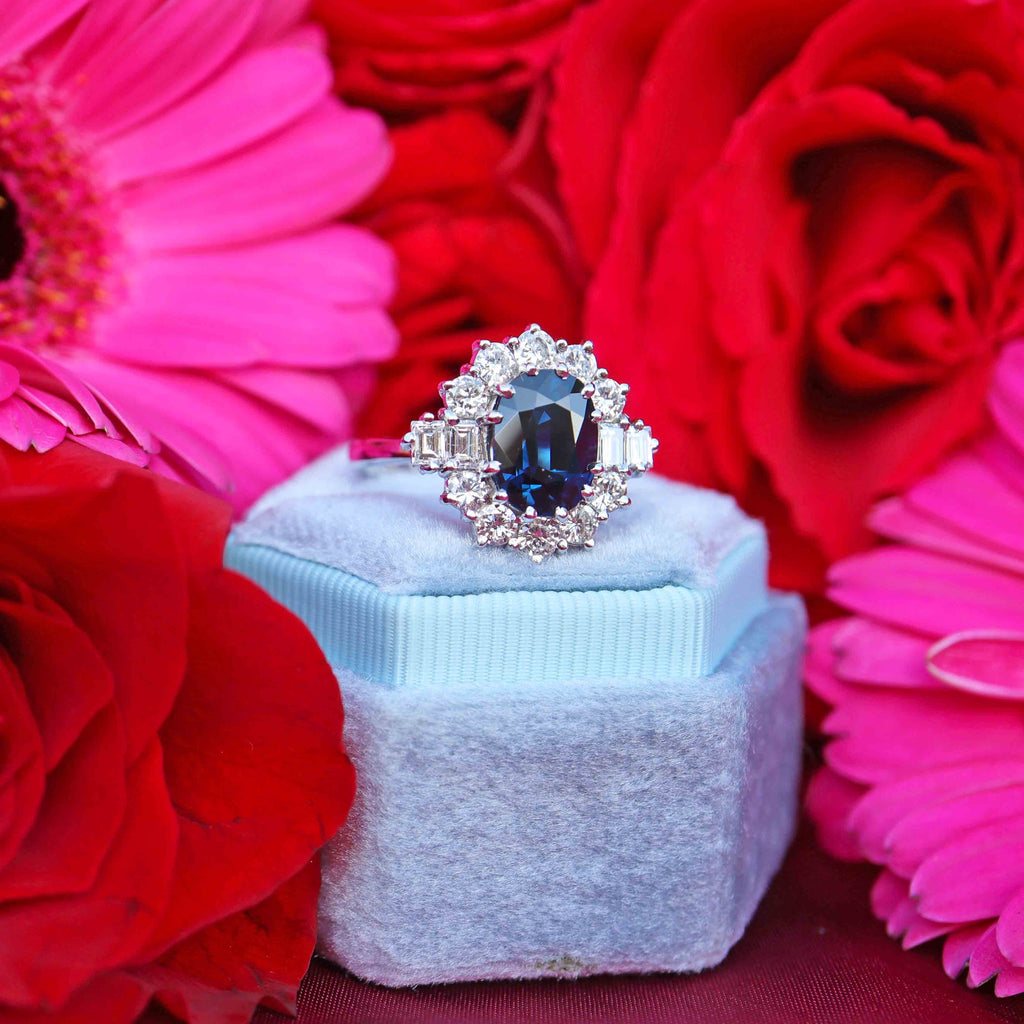 A captivating statement of vintage glamour, this exquisite cluster ring showcases a deep royal-blue sapphire of approximately 3.70 carats, framed by a halo of mixed-cut diamonds totalling approximately 1.00 carat.
