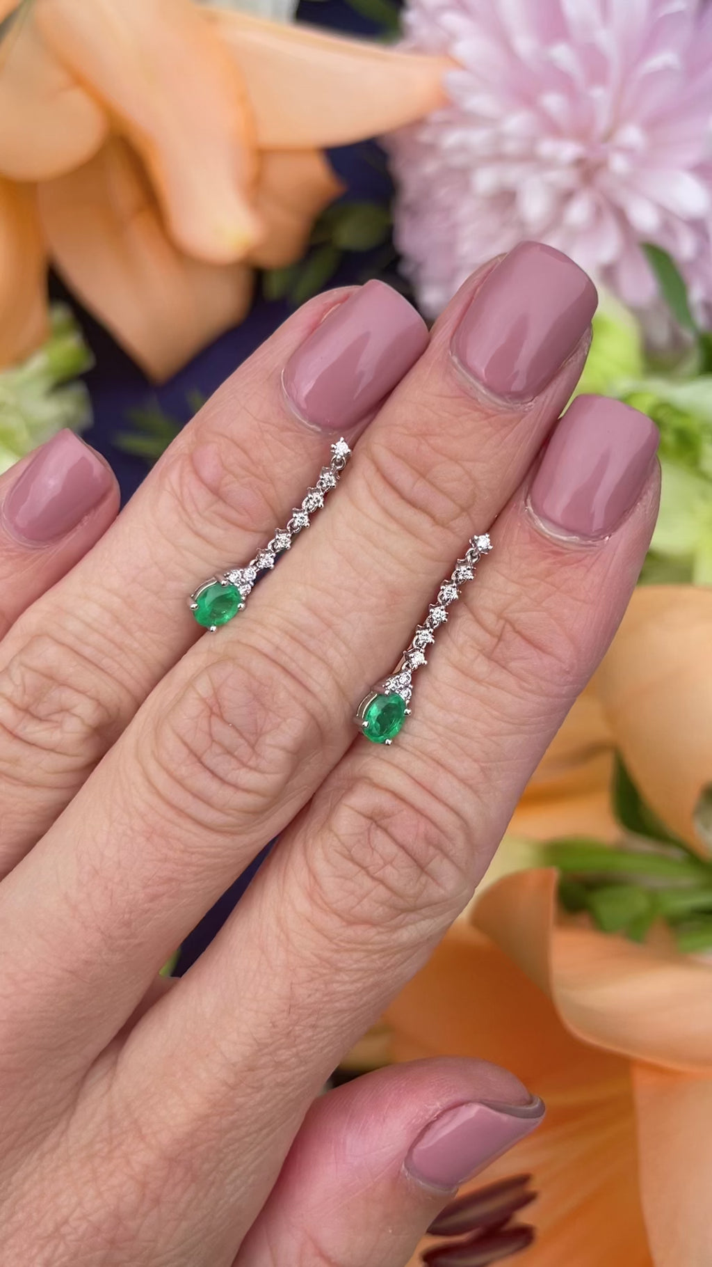 Graceful and refined, these emerald and diamond drop earrings embody understated luxury. Crafted in polished 18ct white gold, each earring showcases a vibrant oval-cut emerald of approx. 0.65 carats total, suspended delicately from a sparkling line of brilliant-cut diamonds. The eighteen diamonds, weighing approx. 0.18 carats in total, add a subtle shimmer that enhances the emeralds’ lush green hue.