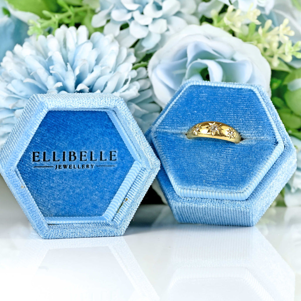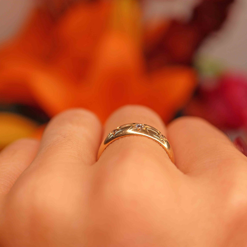 A timeless Edwardian diamond gypsy ring, crafted in rich 18ct yellow gold and hallmarked for Birmingham 1912. Three antique old mine-cut diamonds are set in deeply carved starburst settings, creating a celestial shimmer against the warm, time-softened gold.