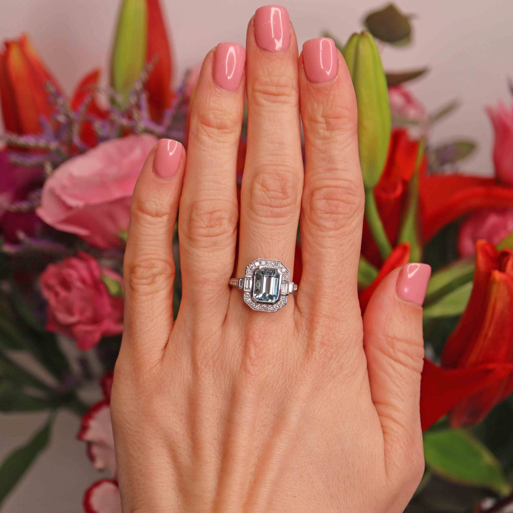Striking and effortlessly elegant, this platinum aquamarine and diamond ring is a contemporary statement inspired by classic Art Deco geometry.