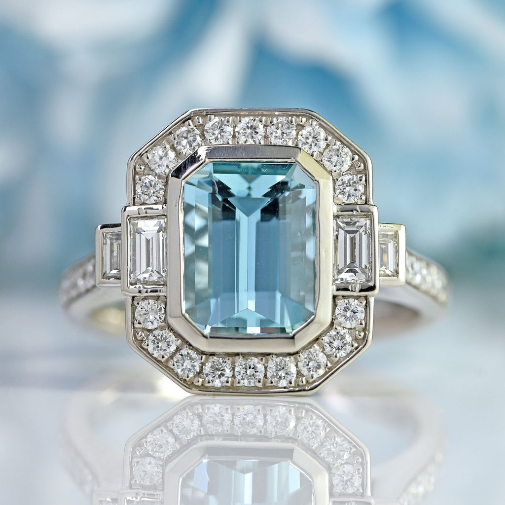 At its centre sits a beautifully proportioned emerald-cut aquamarine weighing approximately 2.05 carats. The stone displays a serene, crystal-clear blue with long, stepped facets creating clean flashes of light and depth. Framing the aquamarine is a sculpted octagonal halo of brilliant-cut diamonds, enhancing the crisp lines of the centre stone while adding exceptional sparkle.
