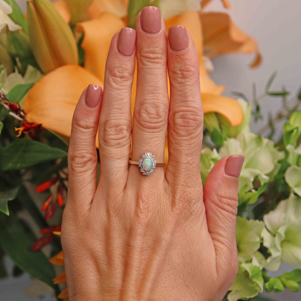 A striking piece of Art Deco design, this exquisite ring captures the bold geometry and timeless glamour of the 1920s. At its centre glows a captivating oval opal, displaying enchanting flashes of green, yellow, orange, and blue fire as it catches the light. Surrounding the opal are eight sparkling diamonds, each set within a platinum frame edged in fine milgrain detail — a hallmark of the era’s meticulous craftsmanship.