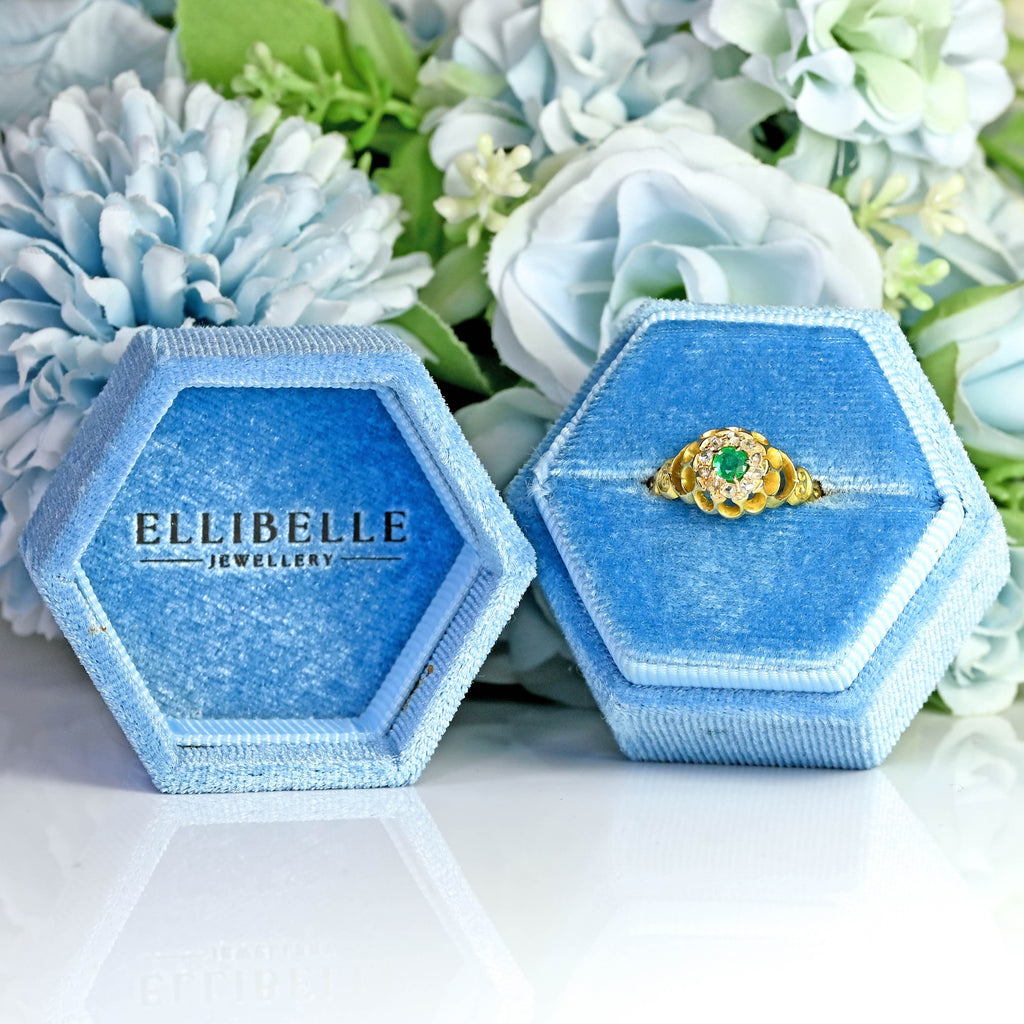 Encircling the emerald is a halo of ten rose-cut diamonds, their softly faceted domes catching the light with a gentle, antique sparkle. Unlike modern brilliant-cuts, these rose-cuts shimmer with a subtle, candlelit glow — perfectly in keeping with the refined character of the Edwardian period.