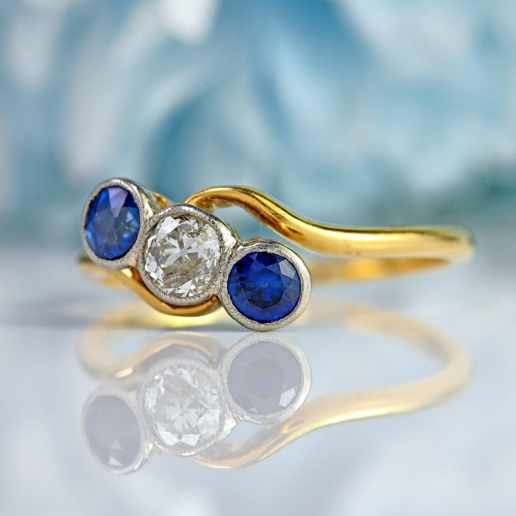 Edwardian Sapphire & Old-Cut Diamond 18ct Gold Three-Stone Crossover Ring