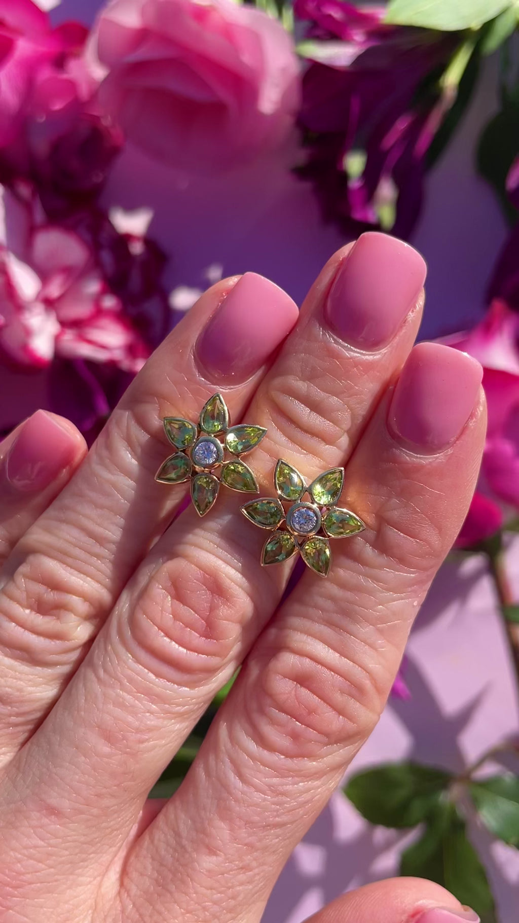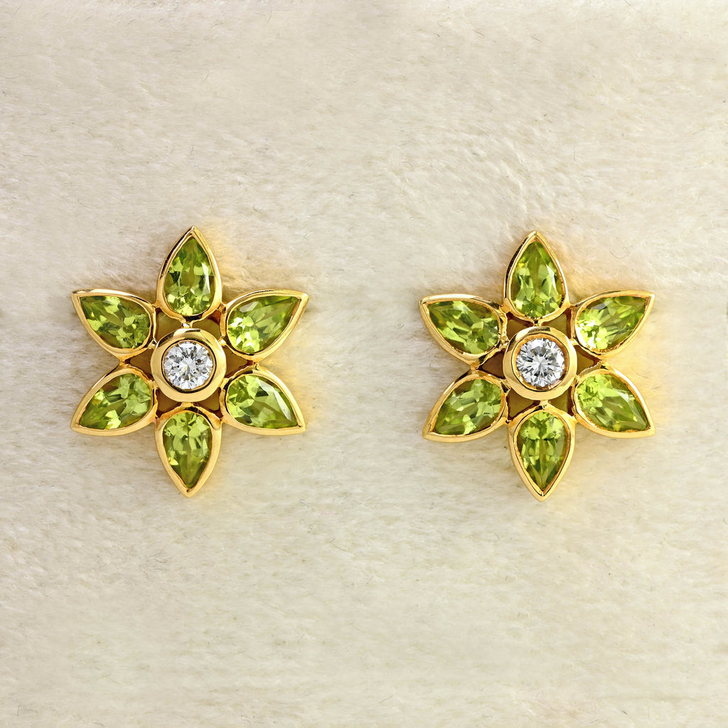 Fresh, vibrant and beautifully sculptural, these 18ct gold flower stud earrings are set with a radiant arrangement of pear-cut peridots, forming an elegant six-petal bloom around a sparkling diamond centre.