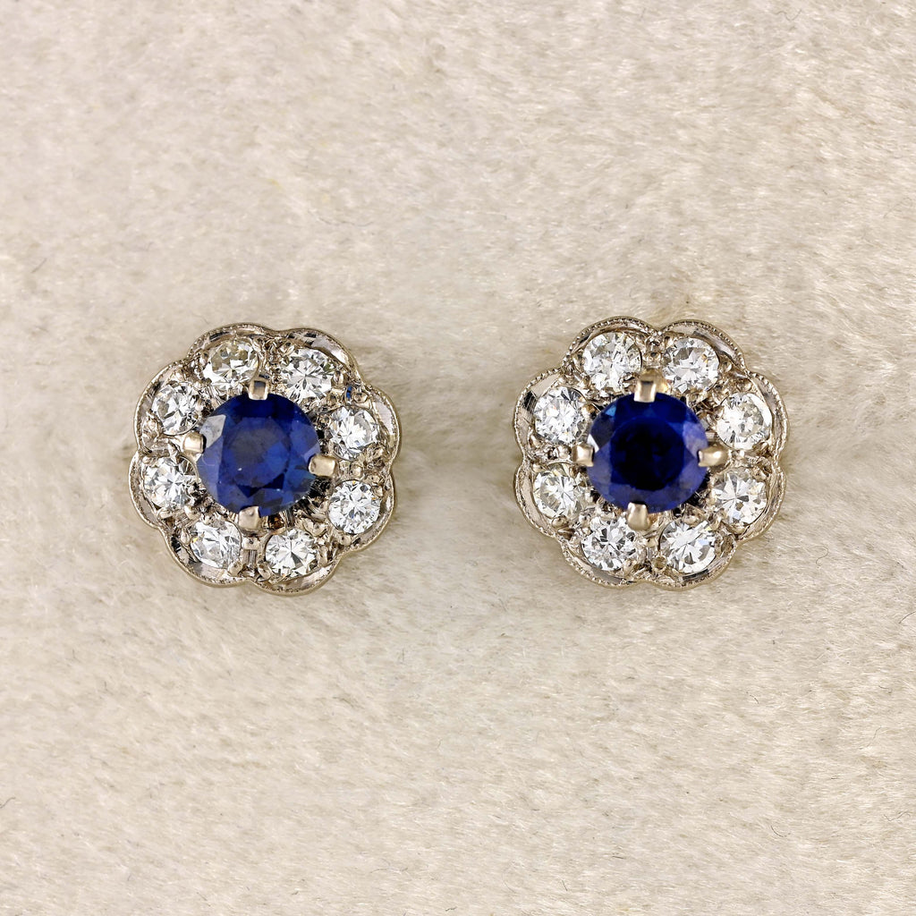 At the heart of each earring lies a deep royal-blue sapphire. The sapphires are surrounded by a halo of bright white brilliant-cut diamonds, weighing an estimated 0.48 carats in total. Their sparkle beautifully enhances the rich blue of the sapphires, creating a classic floral-style cluster.