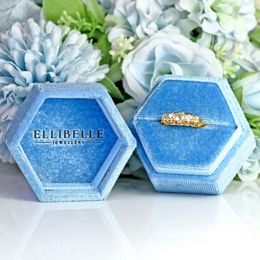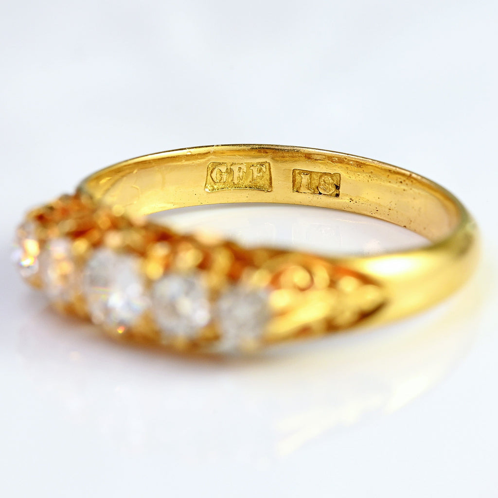 A beautifully preserved Victorian five stone diamond ring, set with a graduating row of sparkling old mine-cut diamonds totalling approximately 0.60 carats. Each hand-cut stone displays the soft, romantic brilliance that only antique diamonds possess — larger facets, gentle fire, and a characterful glow that feels wonderfully alive on the hand.