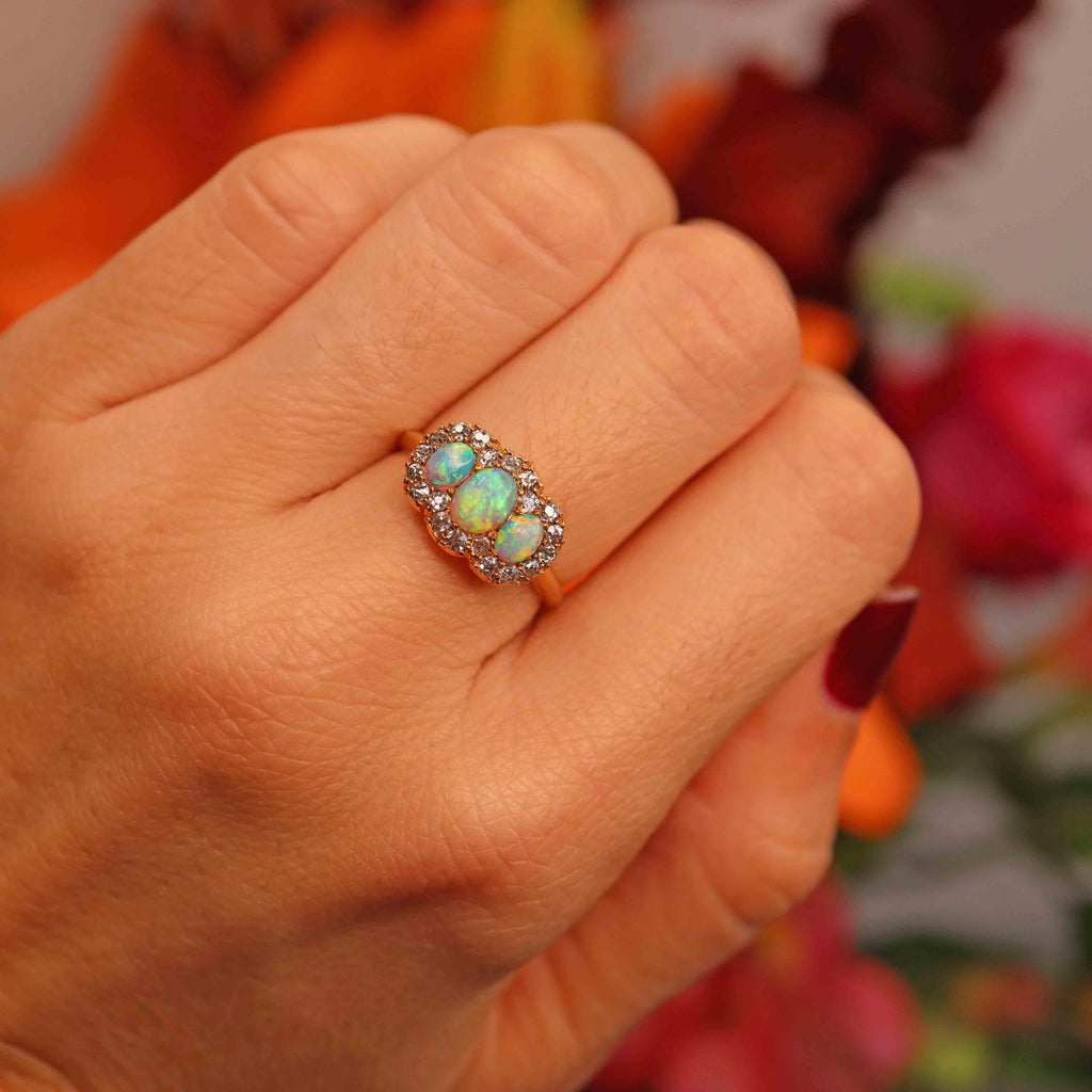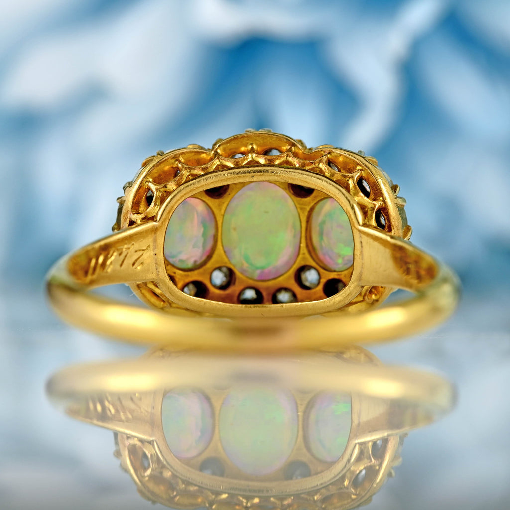 Exquisite and steeped in history, this Victorian opal and old-cut diamond triple cluster ring by renowned jewellers Alabaster & Wilson is a true treasure of its era. Three luminous oval cabochon opals — alive with flashes of green, orange, and blue — are beautifully framed by twenty sparkling old-mine-cut diamonds, all set in rich 18ct yellow gold. The ornate craftsmanship and delicate milgrain edges embody the romantic elegance of the late 19th century, making this a remarkable example of fine Victorian jewellery.