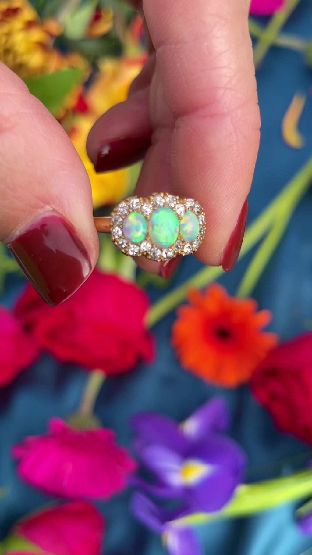 Mesmerising play-of-colour opals framed by antique old-cut diamonds