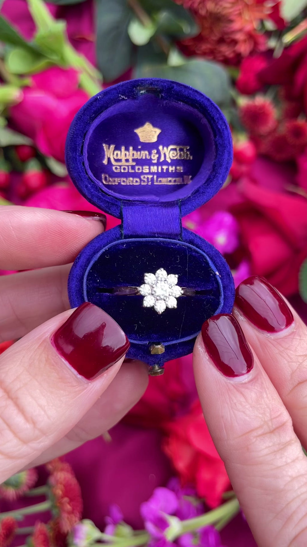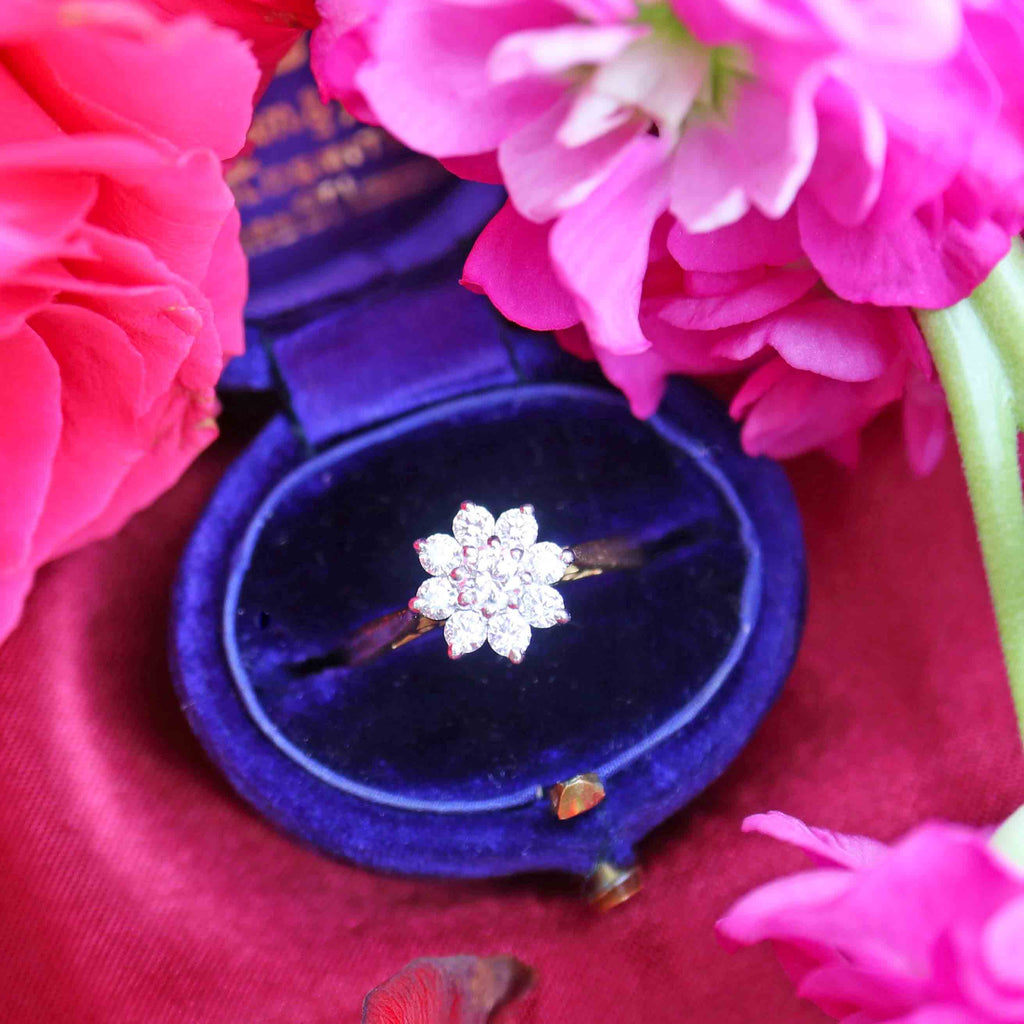 Delicate and radiant, this vintage diamond daisy cluster ring captures the charm of timeless elegance. Crafted in 18ct yellow gold with a white gold-topped setting, nine bright brilliant-cut diamonds form a perfect floral motif, totalling approximately 0.52 carats. Each diamond sparkles beautifully, creating a soft yet dazzling display of light reminiscent of a blooming flower. With its graceful proportions and classic design, this piece makes a wonderful engagement ring or a treasured addition to any fine jewellery collection.