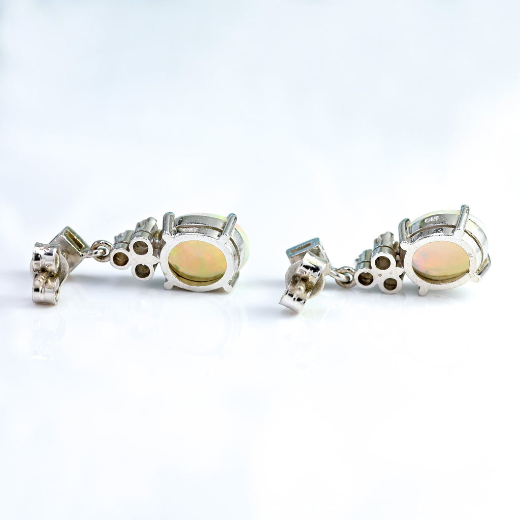 Each earring is centred on an oval opal cabochon, the pair totalling approximately 1.00 carat, displaying a captivating play-of-colour. Above each opal, a trio of brilliant-cut diamonds forms a delicate cluster, suspended from a square diamond-set stud, adding a graceful sense of movement and additional sparkle.