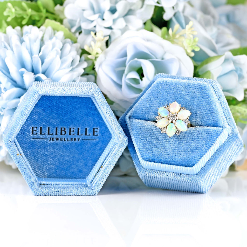 Featuring a timeless snowflake cluster design, the ring showcases six entrancing opals, each displaying a spectrum of rainbow colours with striking flashes of electric blues, vivid greens, canary yellows, and fiery reds set against a serene blue background. These opals are perfectly complemented by seven sparkling white brilliant-cut diamonds, all claw-set to maximise their brilliance. The design gracefully converges into an elegantly tapered, plain polished shank, crafted in rich 18ct yellow gold.