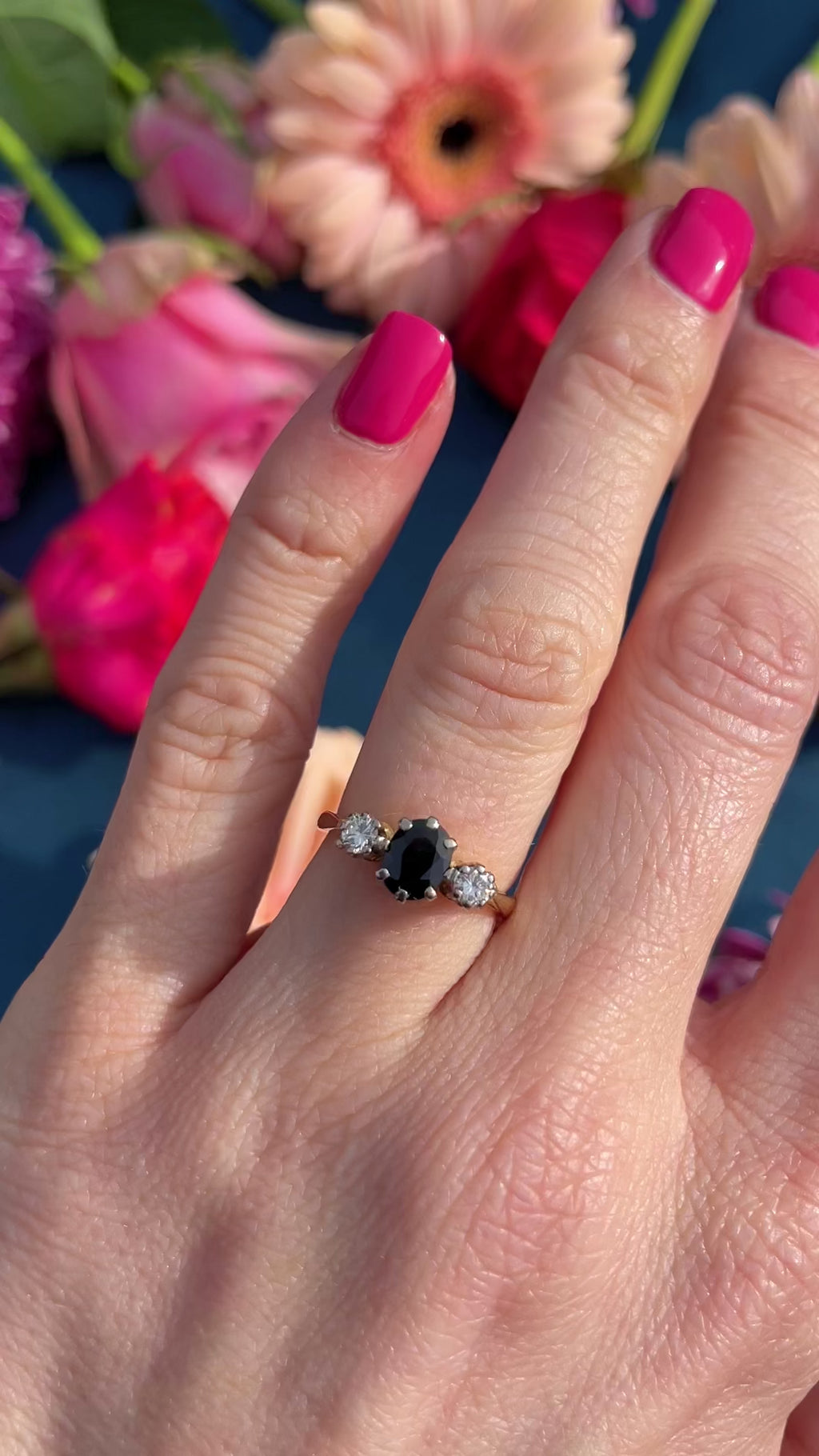 Classic and beautifully balanced, this 1980s vintage three-stone engagement ring centres on a beautiful oval-cut natural sapphire weighing approximately 0.92 carats. The sapphire displays deep, inky-blue tones with subtle flashes of royal blue as it catches the light, giving the ring wonderful depth and presence.