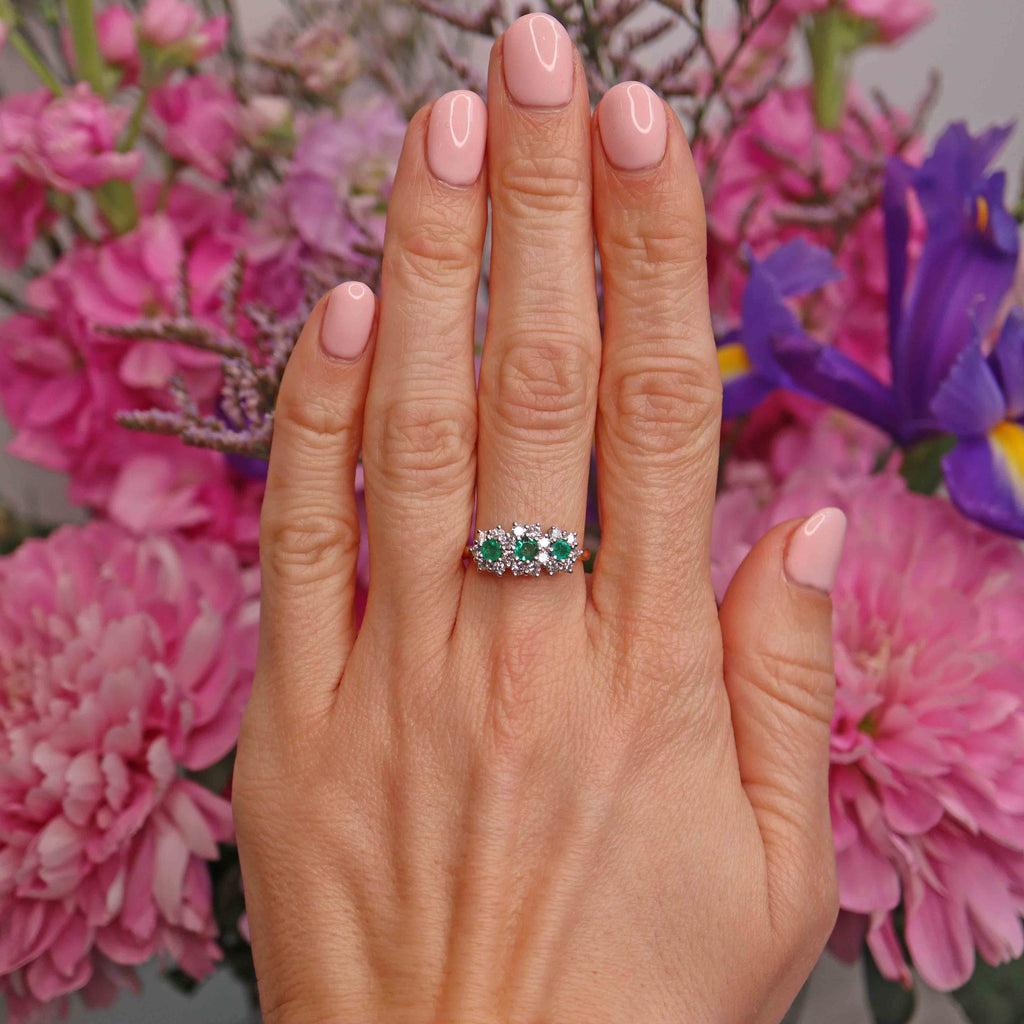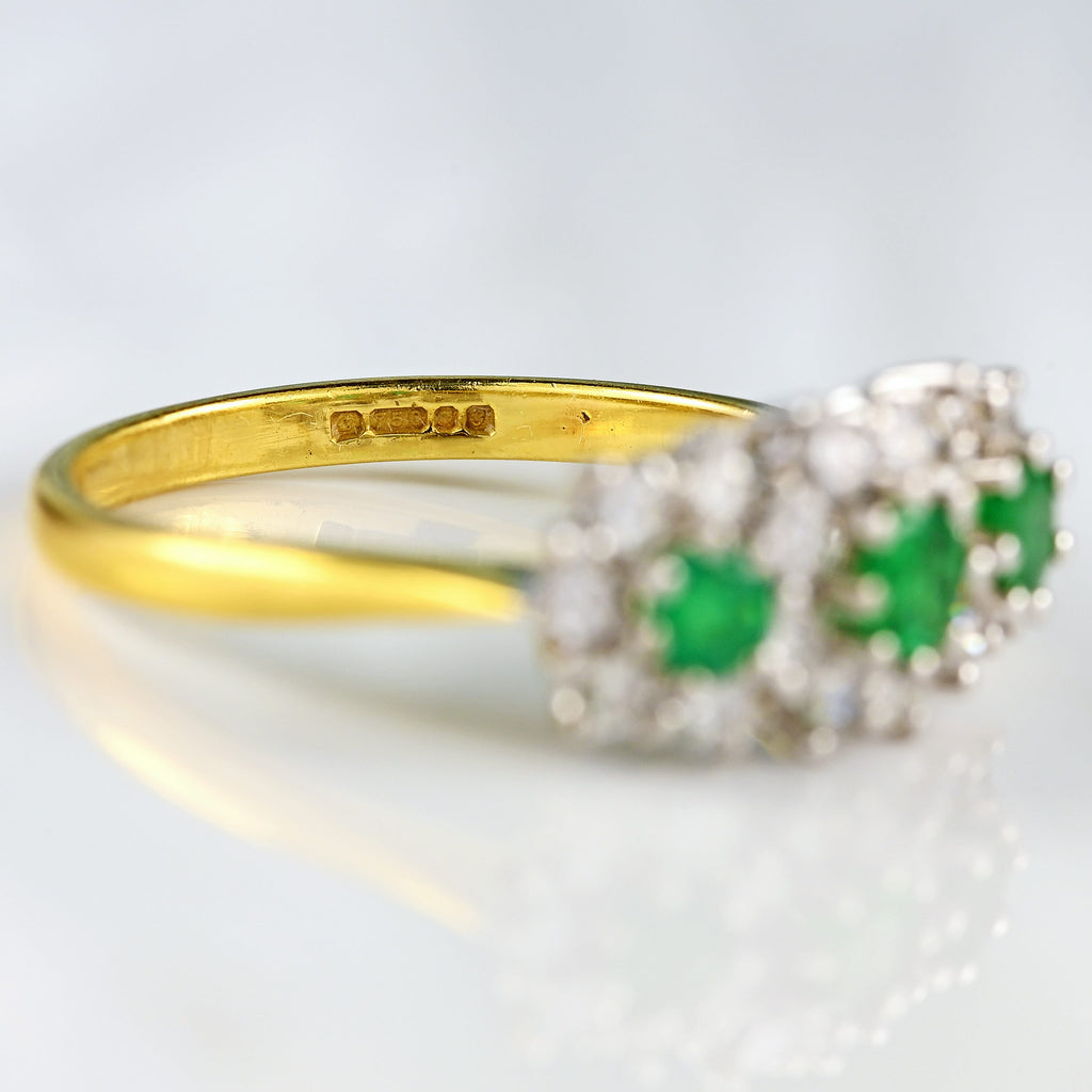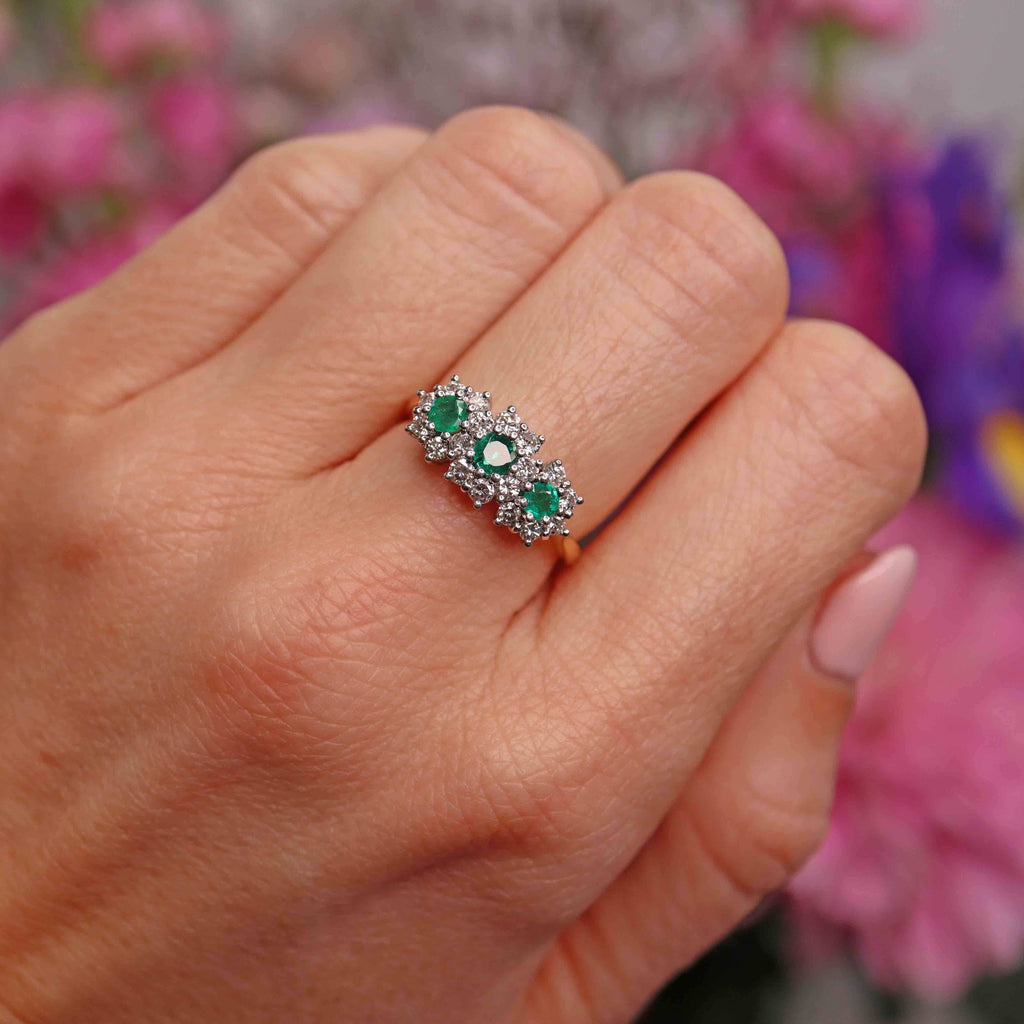 Vintage 1981 Emerald & Diamond 18ct Gold Triple-Cluster Ring
