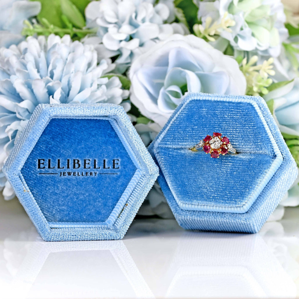 Radiating vintage charm, this vibrant 1981 cluster ring features a lively arrangement of rich round-cut natural rubies encircling a bright central natural diamond, creating a captivating burst of colour and sparkle. Six vivid natural rubies, provide a warm raspberry-red glow that contrasts beautifully with the crisp brilliance of the diamonds. Three round brilliant-cuts and two baguette-cuts frame the cluster with elegant symmetry, adding a refined touch of shimmer.