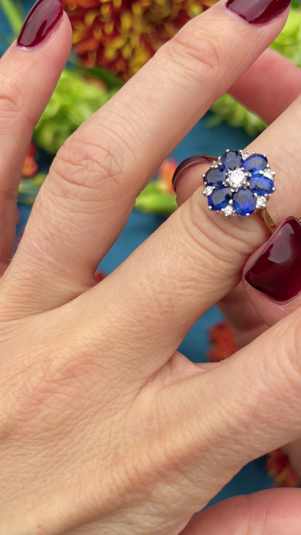 Evoking the romance of a classic floral motif, this 1983 cluster ring shimmers with six richly saturated royal-blue sapphires, perfectly arranged around a central diamond that radiates with exceptional brilliance. Together, the gemstones form a striking flower-like composition that captures timeless sophistication.