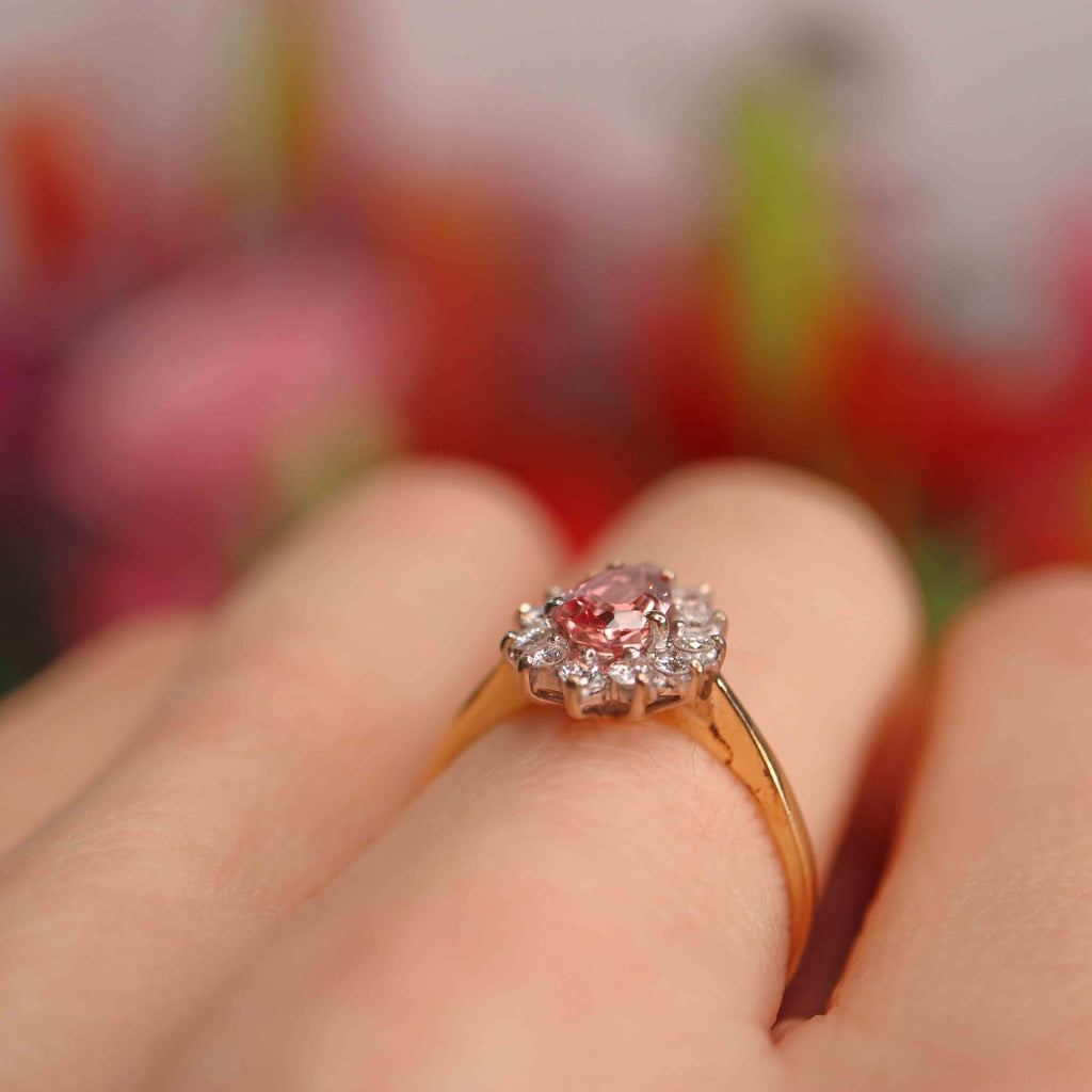 Vintage 1986 Rose-Pink Topaz & Diamond 18ct Gold Pear Cluster Ring