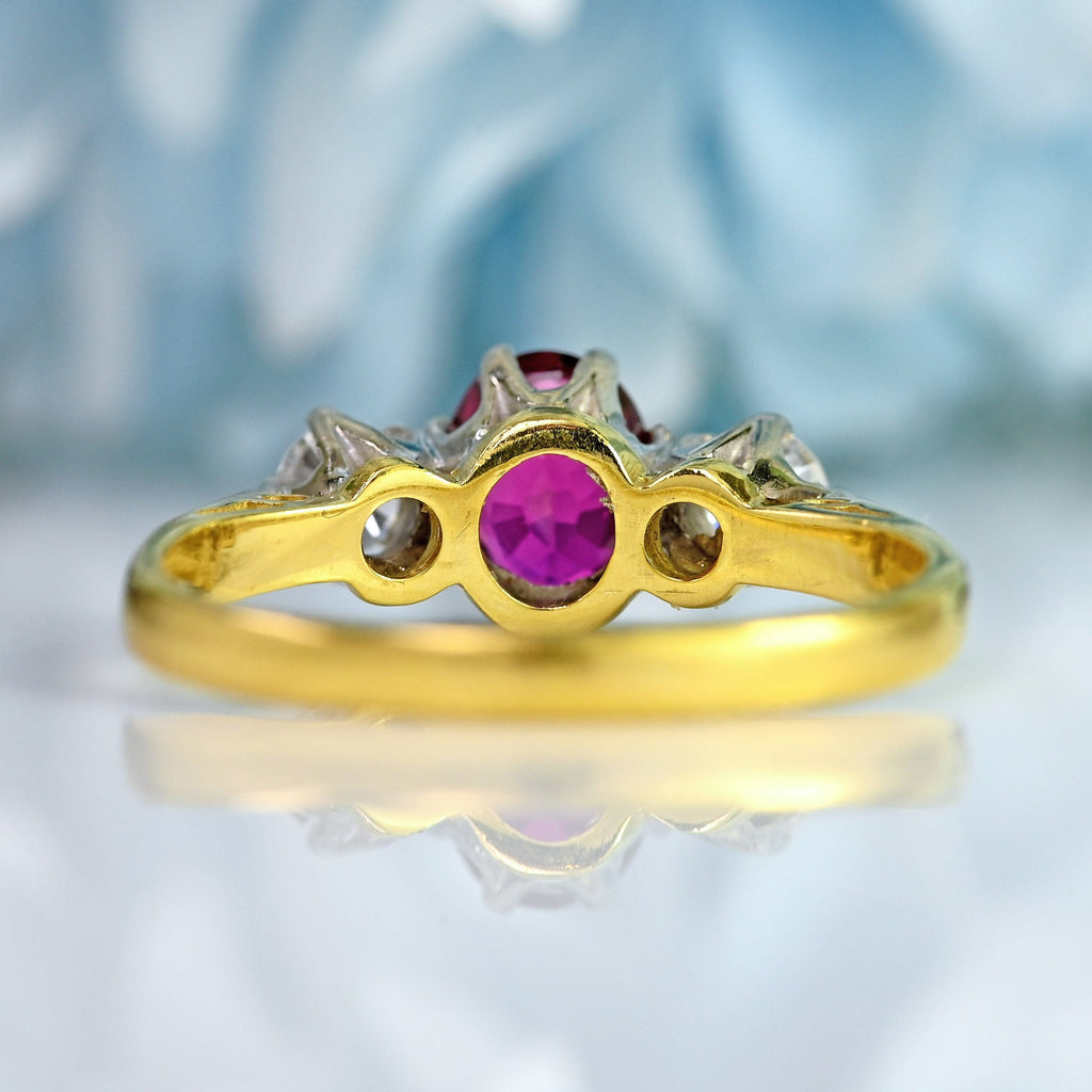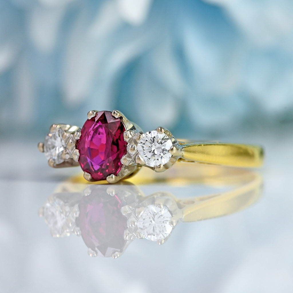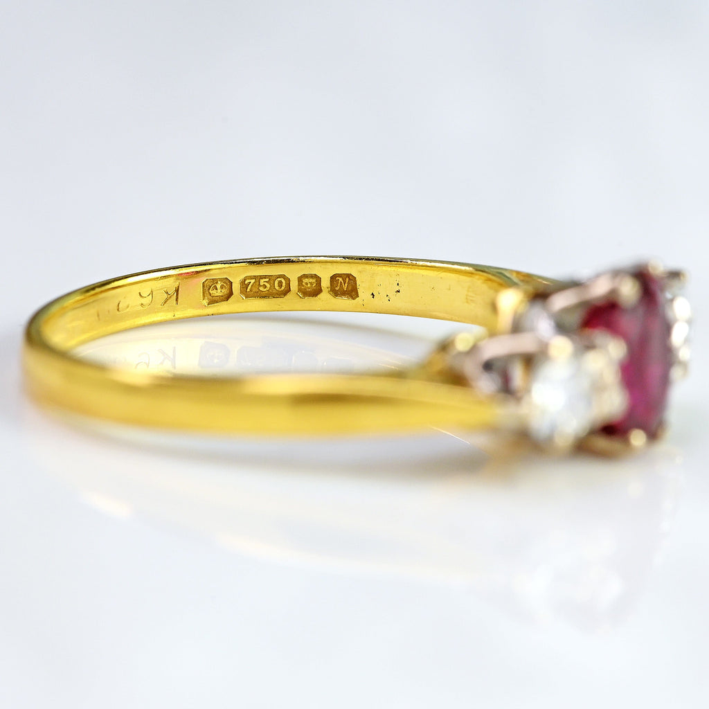 Vintage 1987 Ruby & Diamond 18ct Gold Three-Stone Engagement Ring