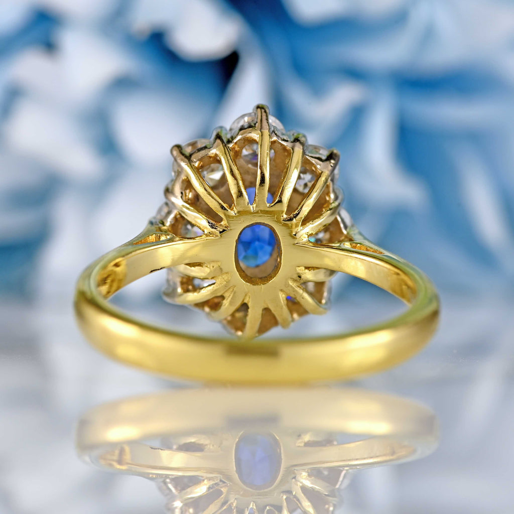A striking vintage sapphire and diamond cluster ring, crafted in luxurious 18ct yellow gold with a white gold setting and fully hallmarked for London 1989. At its centre is a beautifully cut natural sapphire, weighing approximately 1.08 carats, radiating a deep royal-blue hue. It is surrounded by a dazzling halo of brilliant-cut white diamonds, totalling an estimated 0.64 carats, each individually claw-set for maximum brilliance. The openwork gallery and tapered gold band complete the design, blending traditional craftsmanship with elegant proportion and sparkle.