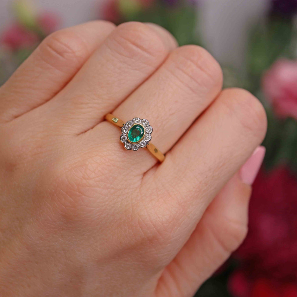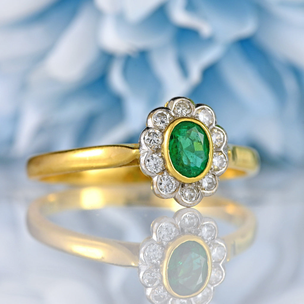 Timeless and beautifully refined, this vintage emerald and diamond cluster ring dates to 1995 and showcases a vivid 0.40ct oval-cut emerald at its centre. The emerald’s rich green tone is elegantly framed by a halo of ten sparkling brilliant-cut diamonds, totalling approximately 0.20 carats, each set in smooth rub-over bezels for a soft, scalloped finish.