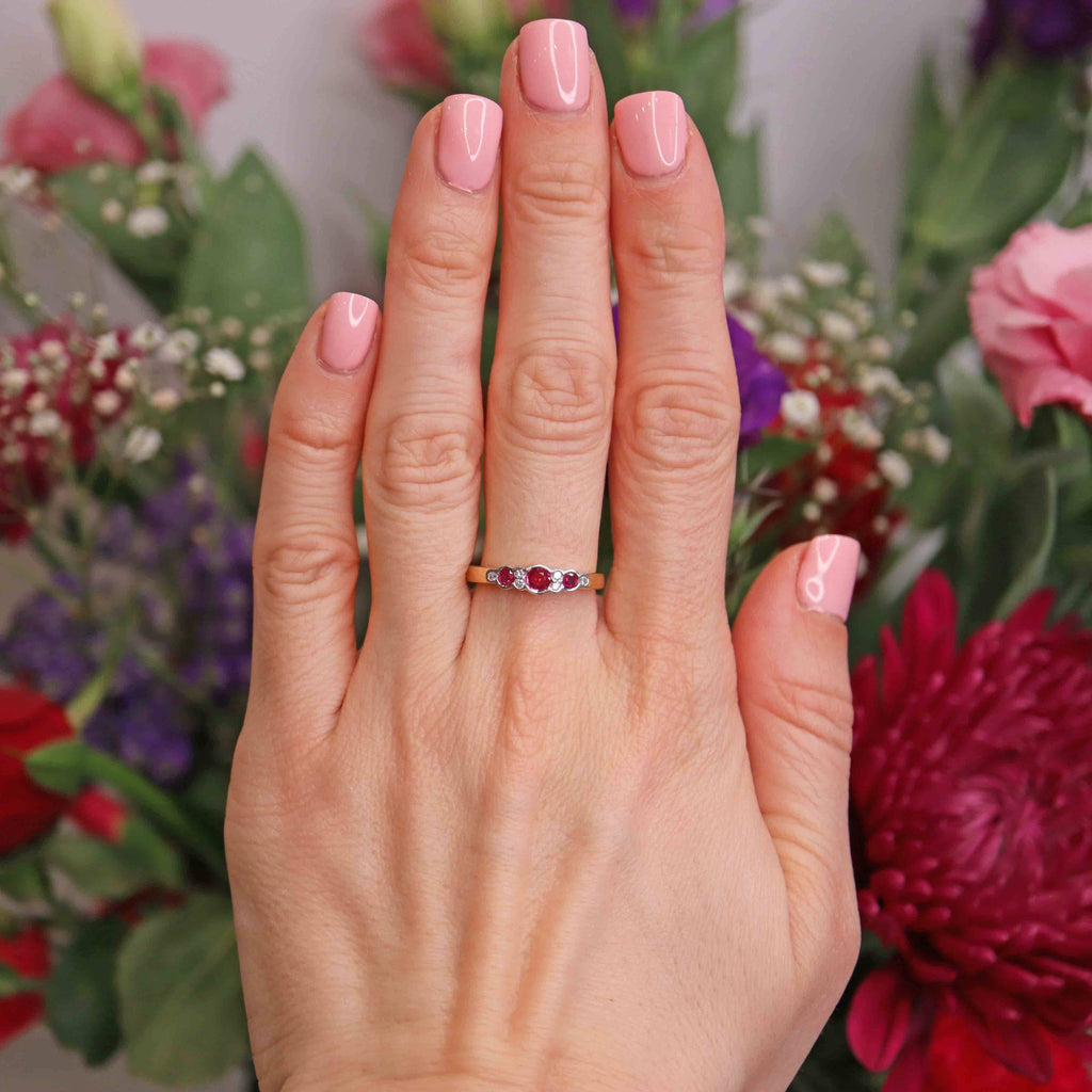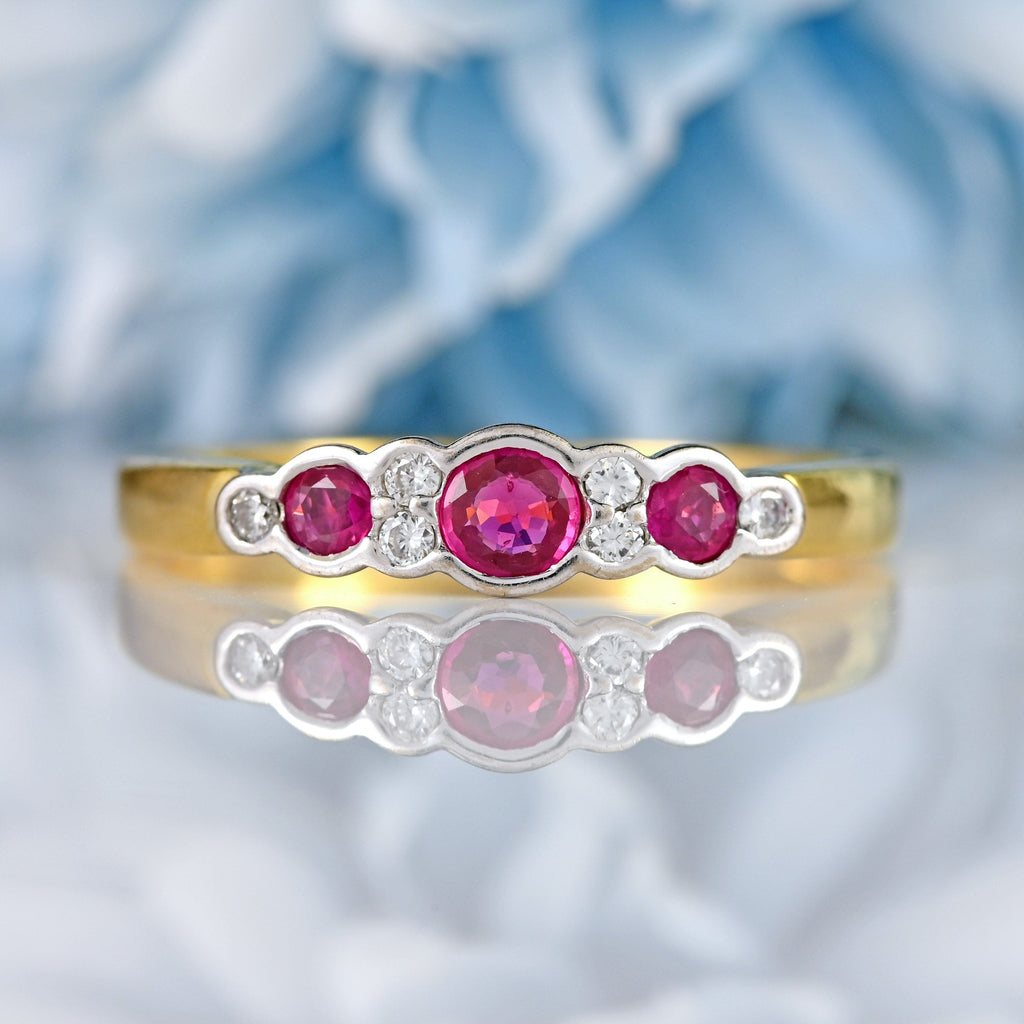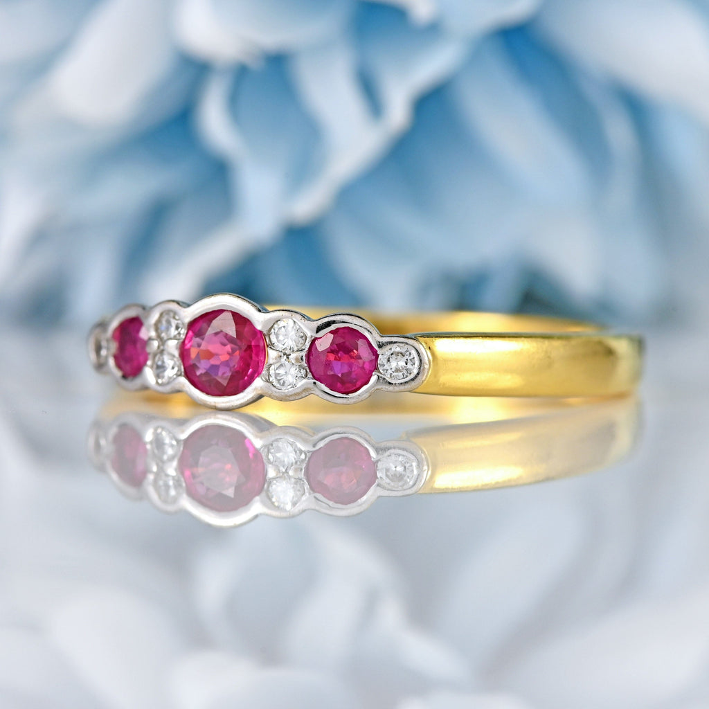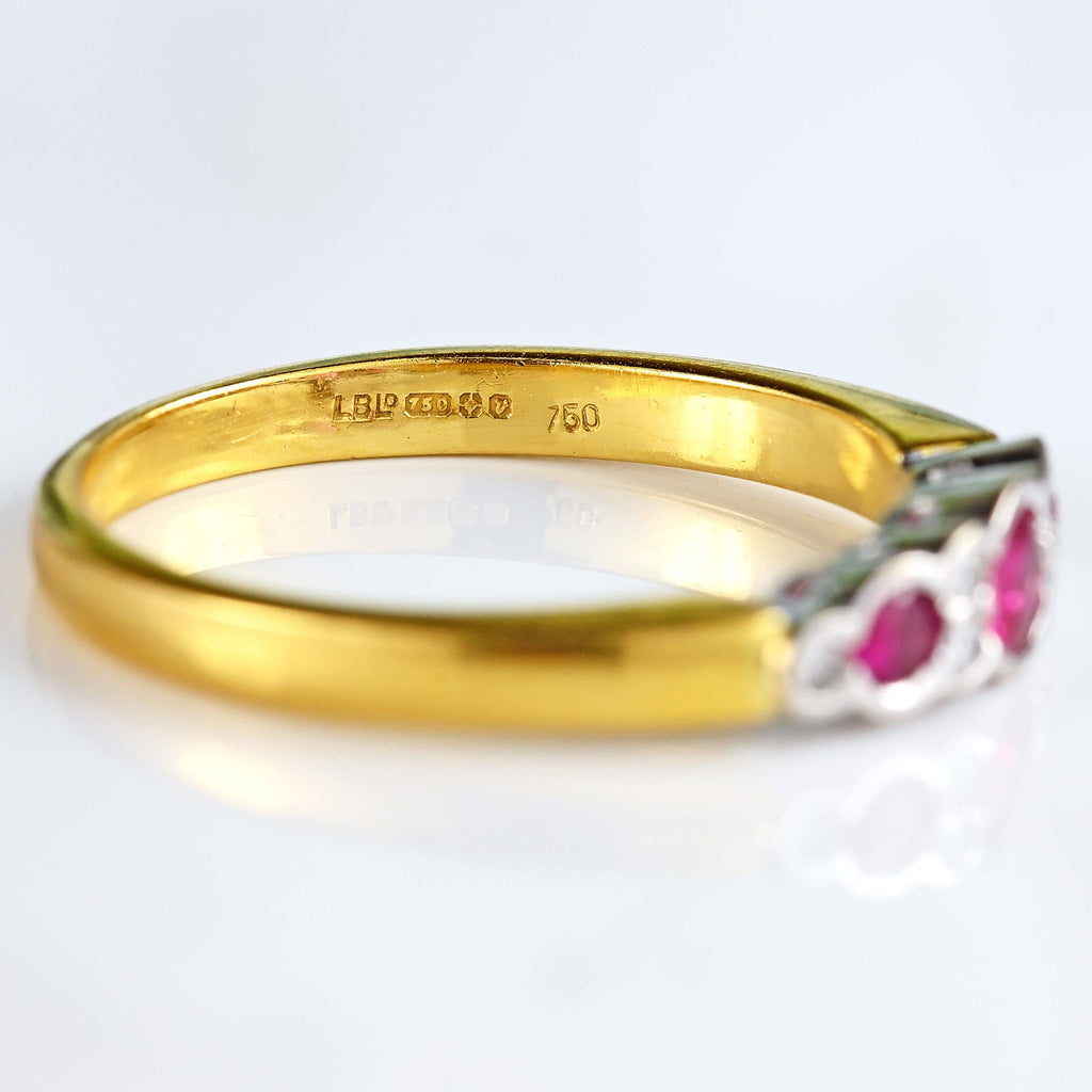 This beautifully balanced vintage nine-stone ring is crafted in rich 18ct yellow gold, with softly contoured white gold bezel settings that cradle a vibrant line of rubies and diamonds. At its centre sits a glowing round-cut ruby, flanked by two further rubies and delicately spaced with brilliant-cut diamonds, creating a graceful rhythm of colour and light across the finger.
