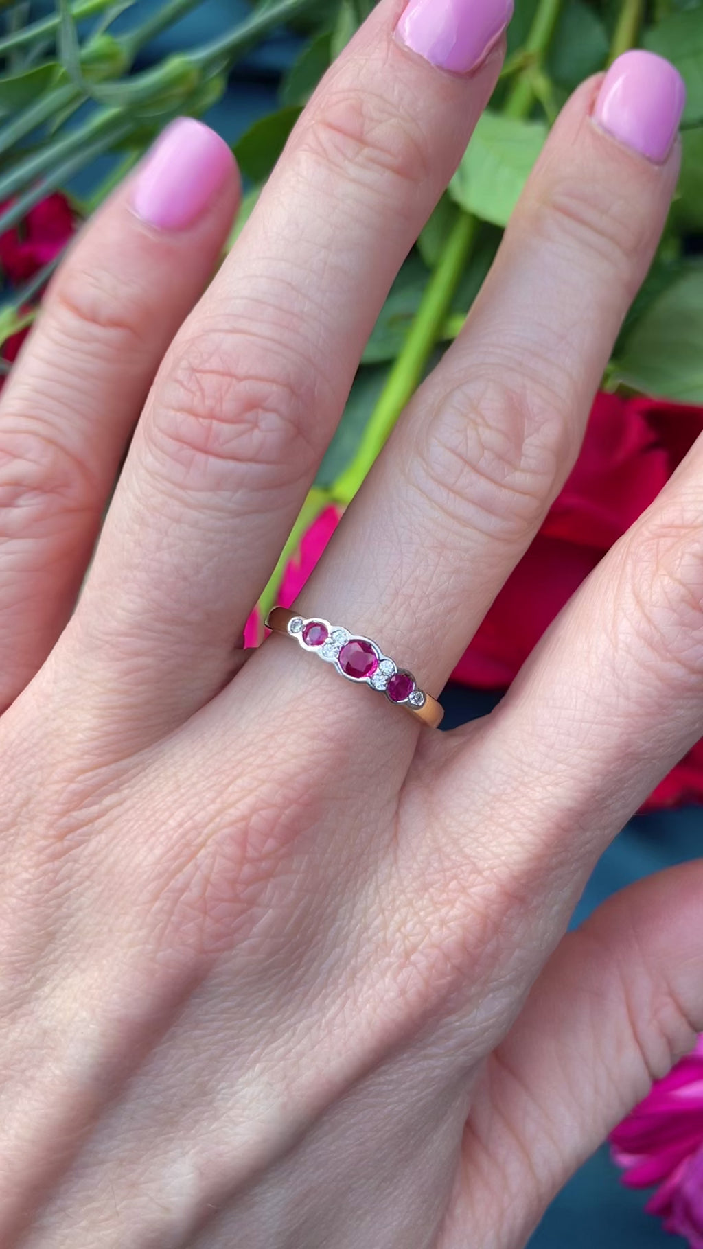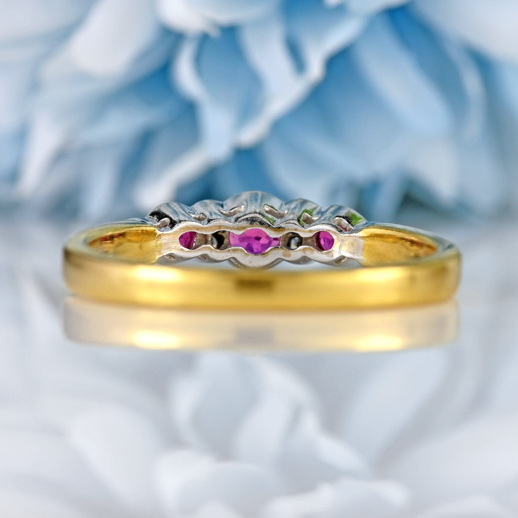 The rubies display a lively raspberry-red hue, full of warmth and character, while the diamonds add a refined sparkle that lifts the entire design. The low-profile bezel settings not only enhance the stones’ brilliance but also make this ring wonderfully practical for everyday wear. Fully hallmarked for London 1995, this piece is a lovely example of late 20th-century craftsmanship, combining timeless elegance with effortless wearability.