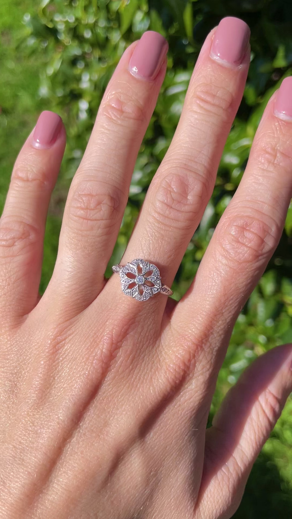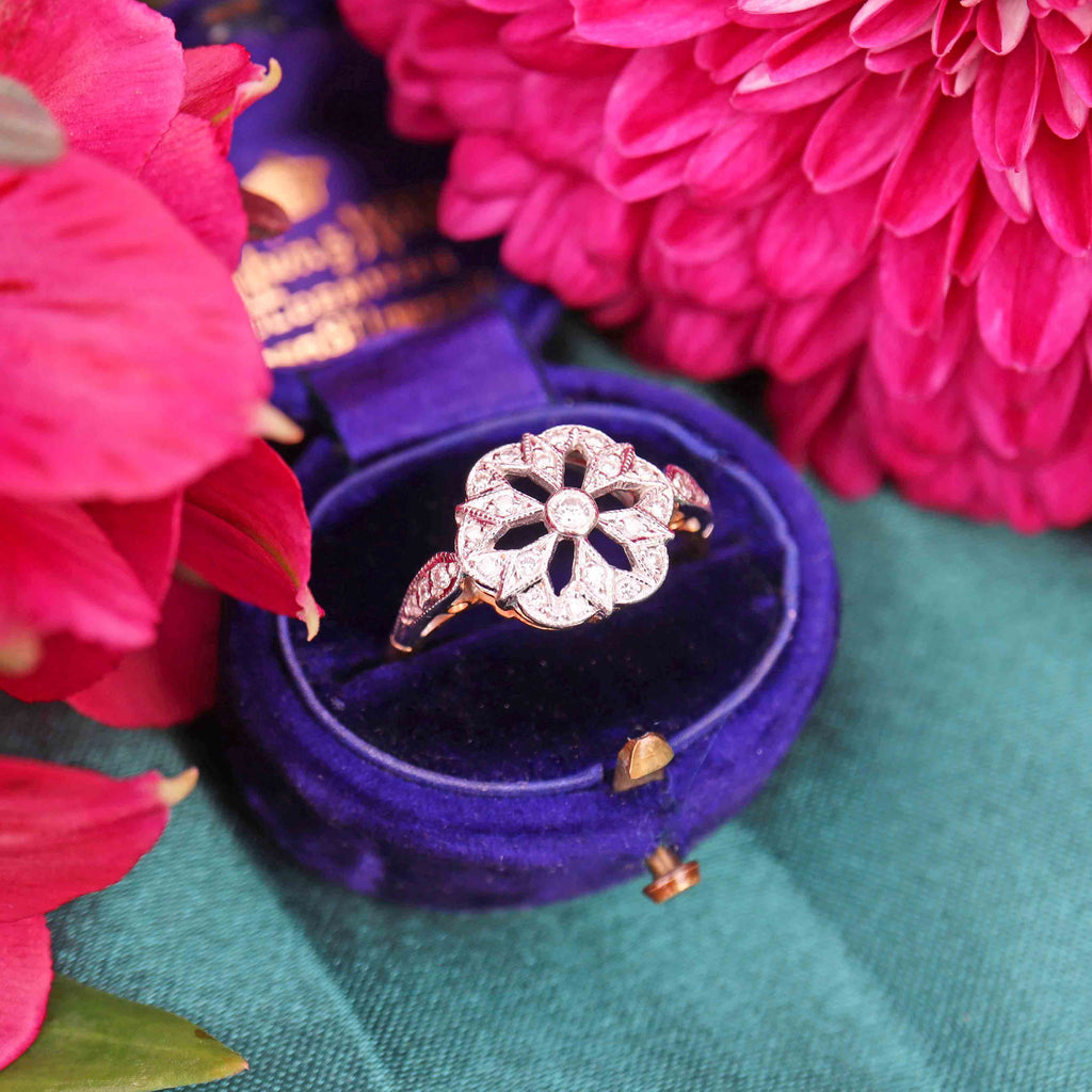 The openwork cluster design forms a delicate floral motif, intricately set with twenty-five brilliant-cut diamonds totalling approximately 0.35 carats. Each diamond sparkles within fine platinum milgrain settings, adding subtle texture and vintage allure. The platinum-topped design sits gracefully on a polished 18ct yellow gold band, creating a sophisticated two-tone contrast.