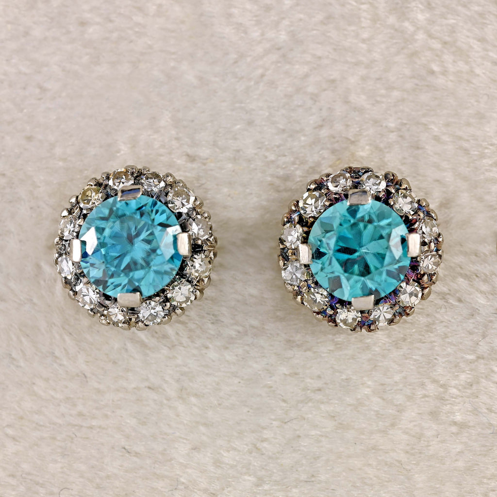 A beautiful pair of vintage stud earrings, showcasing the mesmerising brilliance of natural blue zircon. Each earring is centred with a vivid round-cut zircon of approx. 1.00 carat, admired for its dazzling fire and electric blue hue. Surrounding each centre stone is a sparkling halo of eight-cut diamonds, totalling approx. 0.24 carats, adding elegant contrast and timeless glamour.