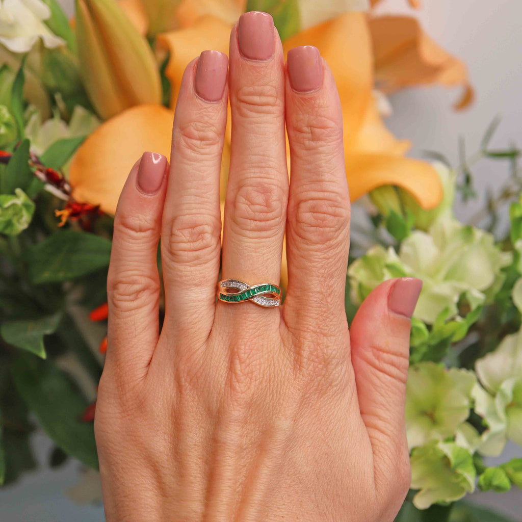 Vintage Emerald & Diamond 18ct Gold Crossover Band Ring