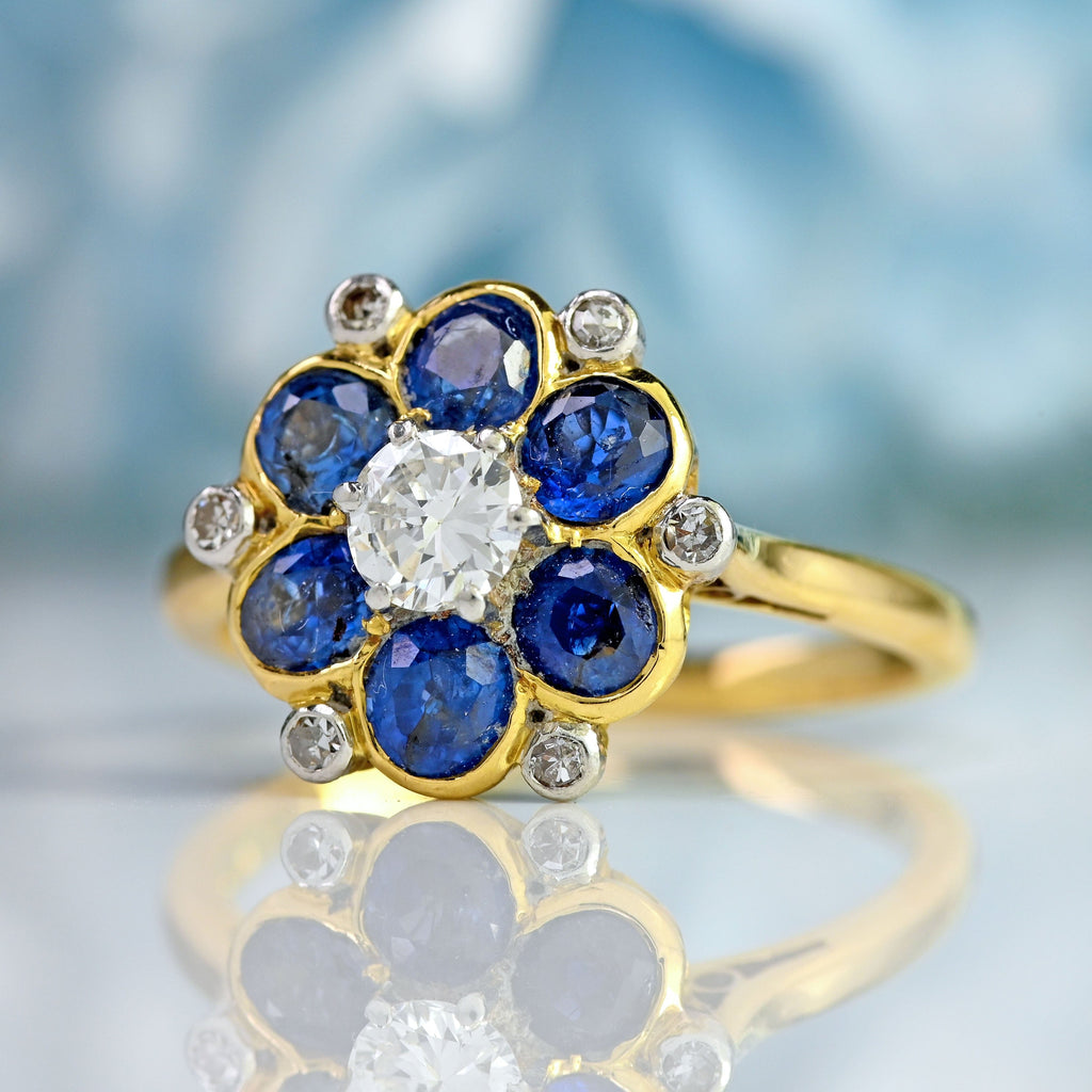 Vintage Sapphire & Diamond 18ct Gold Platinum Floral Cluster Ring