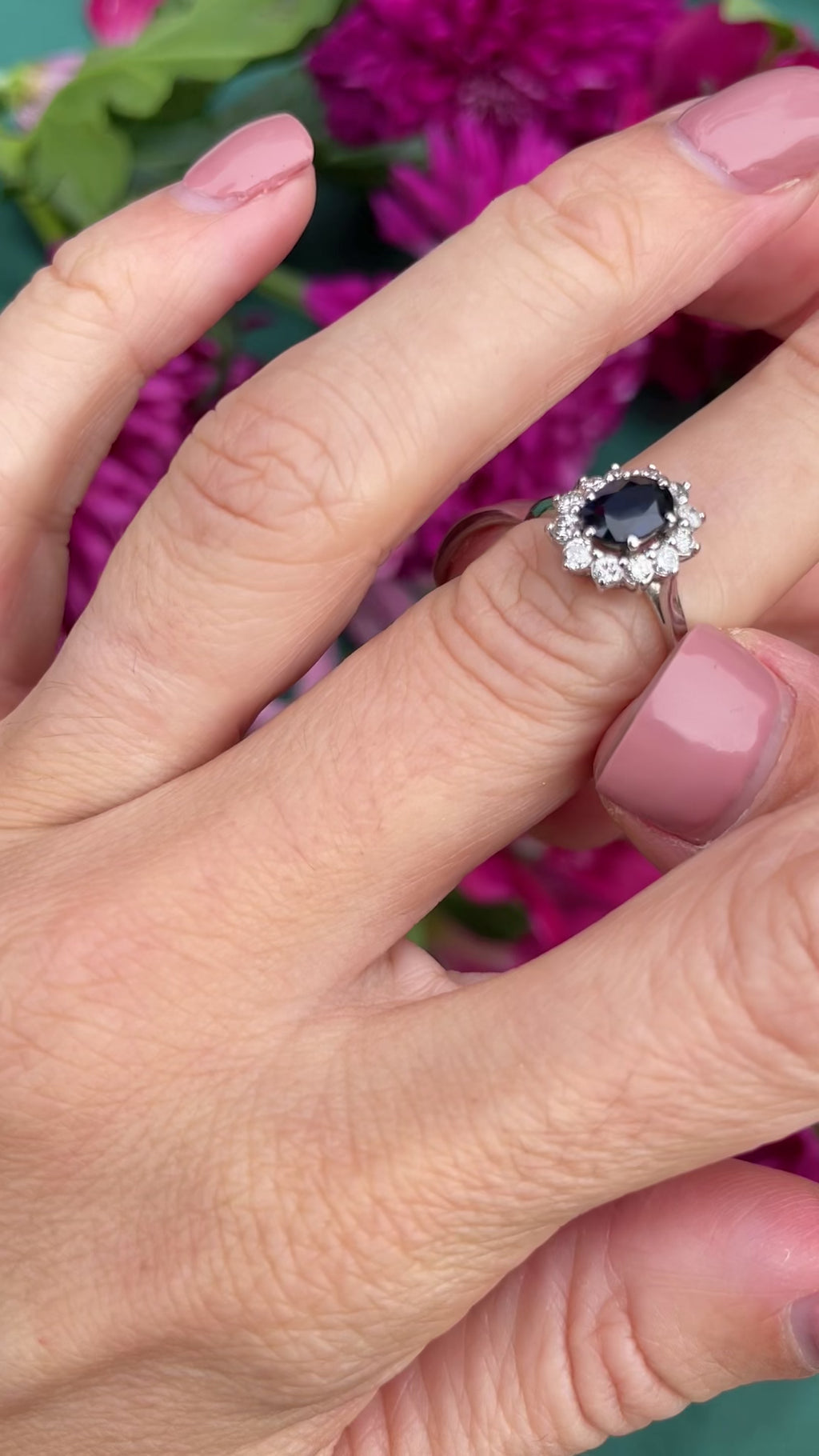 A timeless vintage cluster ring, centred with an oval sapphire of approximately 0.70 carats, radiating a deep, twilight blue hue. Surrounding the sapphire, twelve sparkling brilliant-cut diamonds create a delicate halo, enhancing the stone’s depth and beauty.