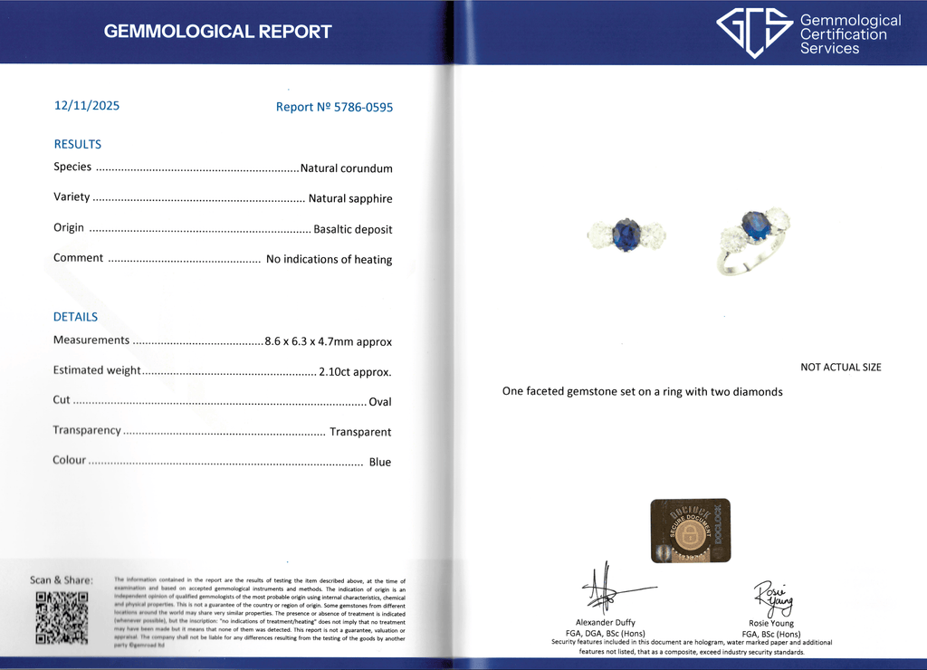 This exceptional sapphire has been independently tested by GCS London, who confirm it to be unheated and of basaltic origin. The ring is accompanied by a GCS laboratory report, providing added assurance of the gemstone’s natural quality and rarity.