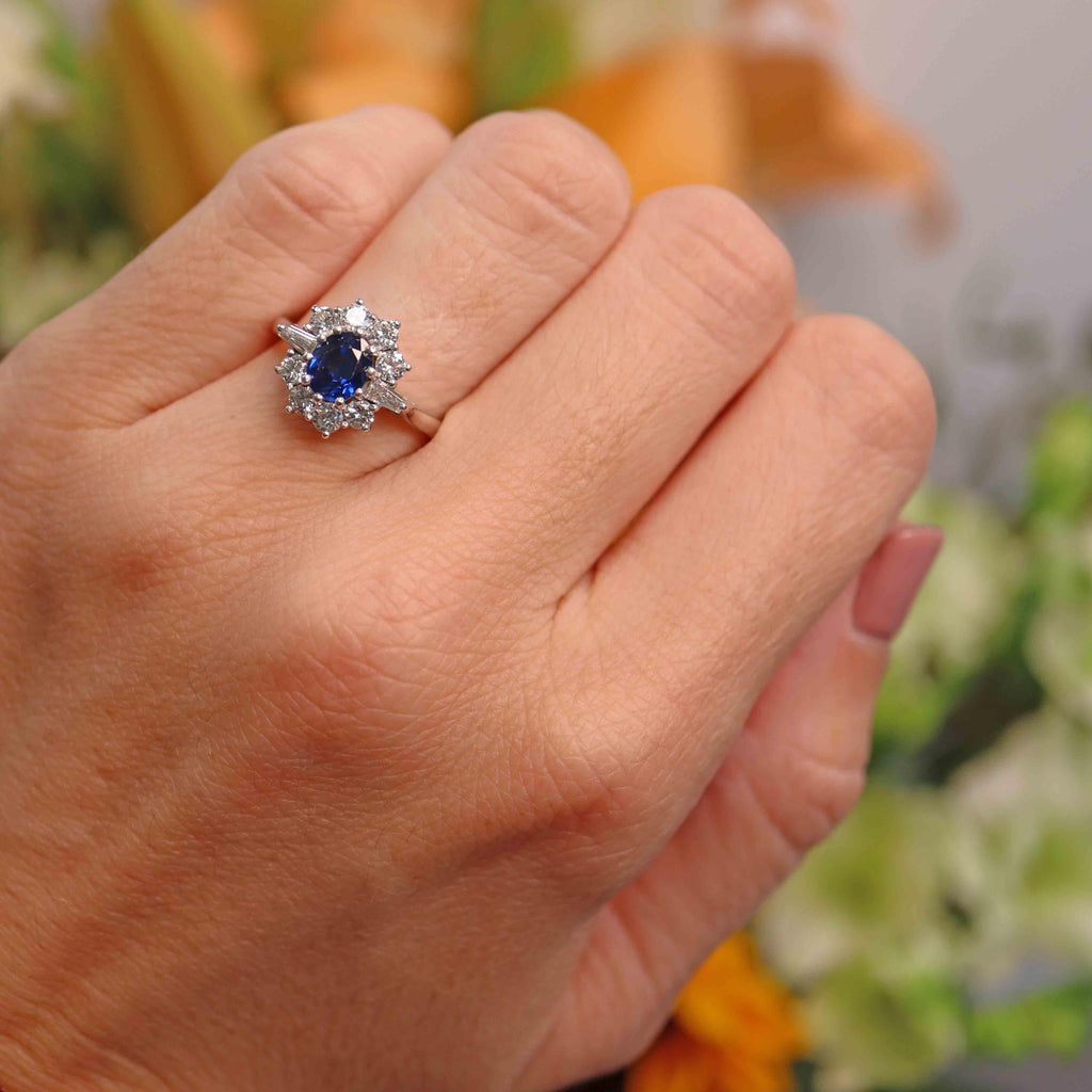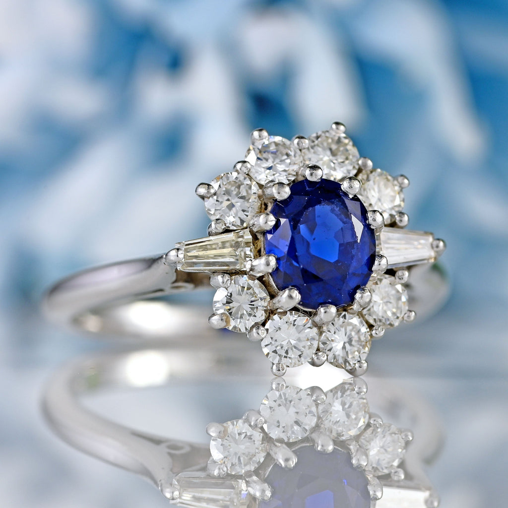 A breathtaking vintage sapphire and diamond cluster ring, elegantly crafted in 18ct white gold. At its heart glows a vivid royal-blue oval sapphire of approx. 0.85 carats, surrounded by a dazzling halo of vari-cut diamonds — eight brilliant-cuts and two slender trapeze-cuts totalling approx. 0.50 carats. The diamonds crisp sparkle perfectly complements the sapphire’s deep, velvety hue, while the raised basket setting allows light to dance through each facet. Timeless and refined, this ring captures classic sophistication in every detail.